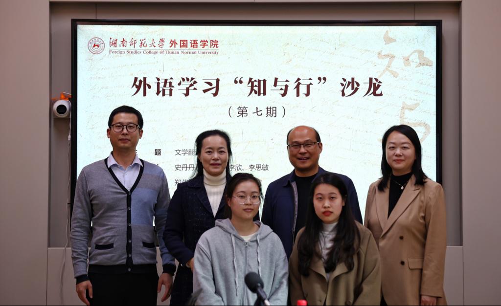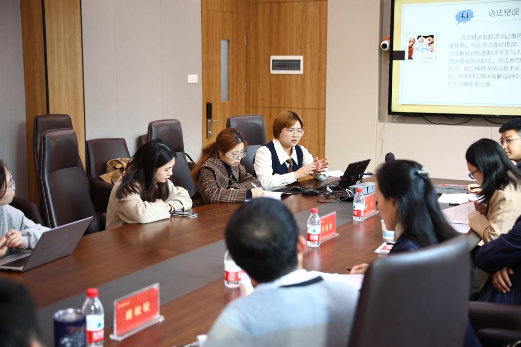 2020级英语专业本科生史丹丹、陈璟,2021级英语笔译方向硕士研究生李欣、李思敏分别以“机器翻译译文缺陷分析——以雷锋生平事迹陈列馆讲解词为例”“功能主义翻译目的论指导下的湘菜菜名英译研究——以火宫殿菜单菜名为例”“生态翻译学视阈下张家界旅游景区讲解词翻译的‘三维’转换”“跨文化交际学视角下旅游景点名称英译研究——以张家界旅游景区为例”等为主题,结合文学翻译实践的相关要求,分享报告了自身在专业学习和社会实践中的收获与思考。