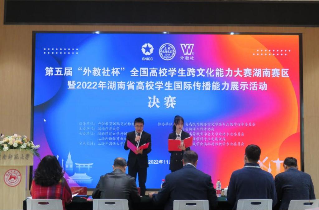 本次大赛由澳门pg官方电子平台主办,澳门pg官方电子平台及上海外语教育出版社承办,共38支代表队参赛,经过激烈比拼,最终15支队伍进入决赛。决赛内容包括“情景评述及回答评委提问”“名言名句解读”和“向世界讲述湖湘故事:湖湘精神”三个环节。参赛选手们呈现了一个个生动新颖的跨文化作品,展现了优秀的跨文化意识和从事跨文化交际的潜力。最终澳门pg官方电子平台等2支队伍获得特等奖,湖南涉外经济学院等6支队伍获得一等奖,湖南工商大学等13支队伍获得二等奖,邵阳学院等17支队伍获得三等奖,湖南农业大学等2支队伍获得最佳案例奖。