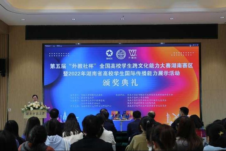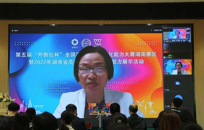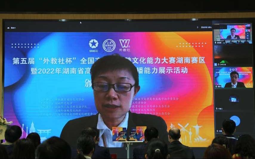(通讯员 李澧)11月26日,第五届“外教社杯”全国高校学生跨文化能力大赛湖南赛区暨2022年湖南省高校学生国际传播能力展示活动决赛以及颁奖典礼在澳门pg官网腾龙楼613举行。本次大赛采用线上线下结合的方式举办。主办单位澳门pg官方电子平台副校长刘子兰和承办单位上海外语教育出版社副总编辑谢宇出席了颁奖典礼并致辞,澳门pg官网院长曾艳钰为选手们在线颁奖。颁奖典礼由澳门pg官网副院长刘白主持。