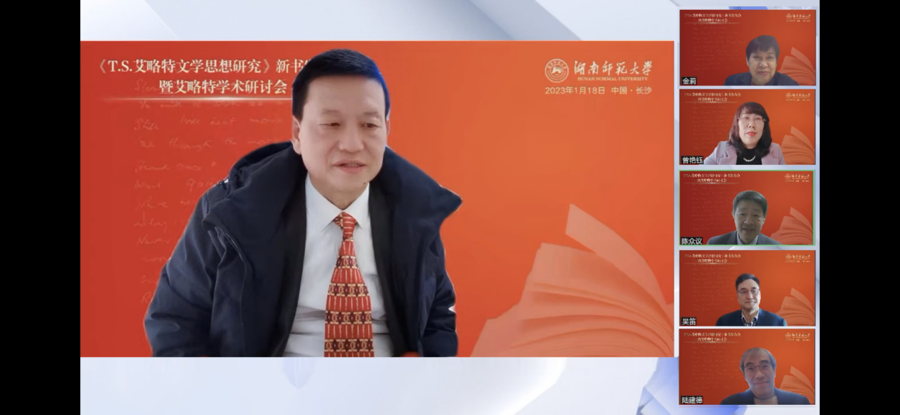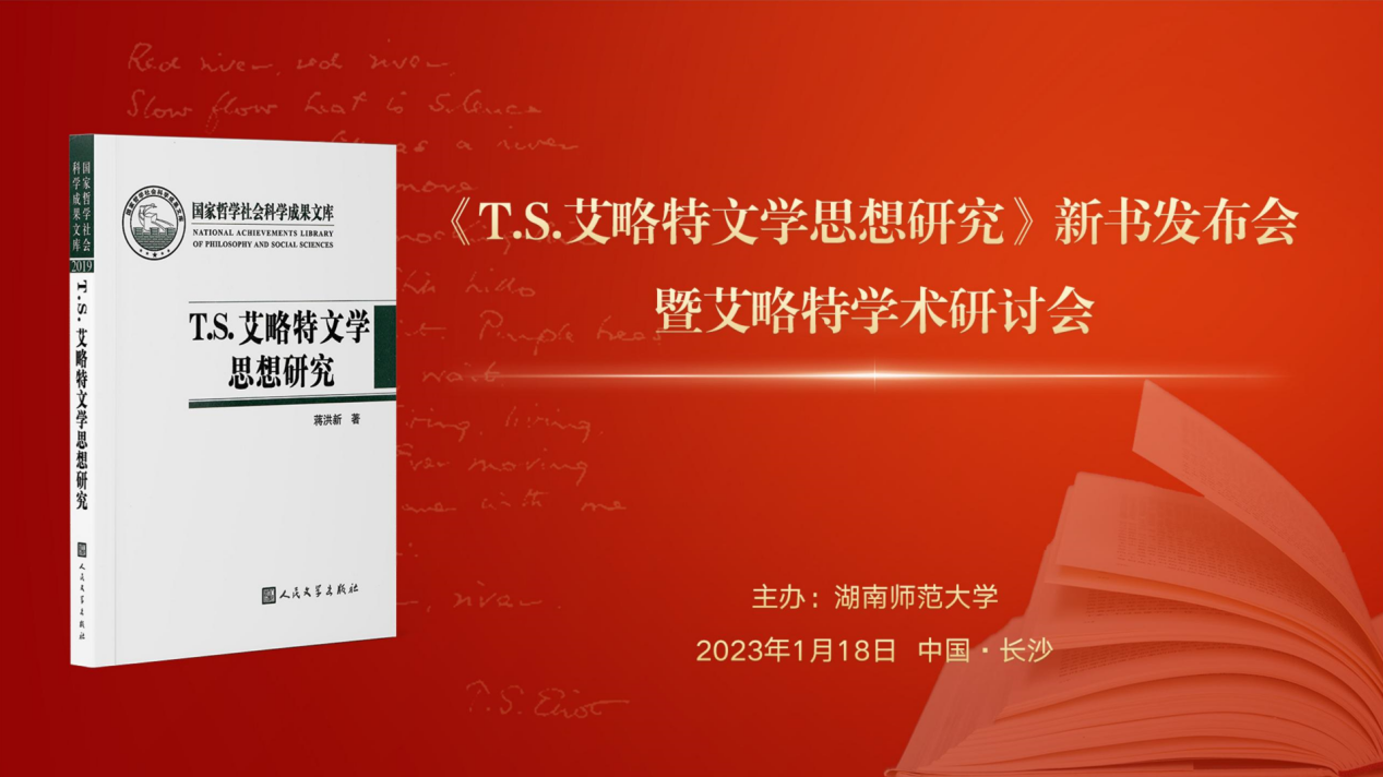 (通讯员 王耀光)1月18日,欧洲科学院院士、澳门pg官方电子平台党委书记蒋洪新教授撰写的《T.S.艾略特文学思想研究》新书发布会暨艾略特学术研讨会在云端举行。会议邀请到来自中国社会科学院、清华大学、中国人民大学、北京外国语大学、上海外国语大学、浙江大学、南京大学、厦门大学、上海交通大学、四川外国语大学、广东外语外贸大学、江西师范大学、浙江工商大学、闽南师范大学、上海师范大学、杭州师范大学等高校的专家学者代表出席并座谈,共话艾略特研究。活动分为新书发布会和学术研讨会两部分,分别由北京外国语大学王佐良外国文学高等研究院院长金莉教授、澳门pg官方电子平台院长曾艳钰教授主持。