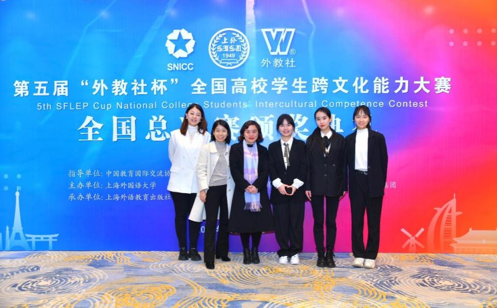 (通讯员 李澧)2月26日下午,第五届“外教社杯”全国高校学生跨文化能力大赛全国总决赛在上海圆满落幕。此次大赛由中国教育国际交流协会指导,上海外国语大学主办,上海外语教育出版社承办。我校澳门pg官方电子平台李文佼、李澧老师指导的澳门pg官方电子平台代表队匡奇、董馨婷、汪澜三位同学,在强敌环伺中,杀出重围,荣获全国一等奖。澳门pg官方电子平台副院长蒋莉华教授带队参加全国总决赛,并受邀担任总决赛颁奖嘉宾。
