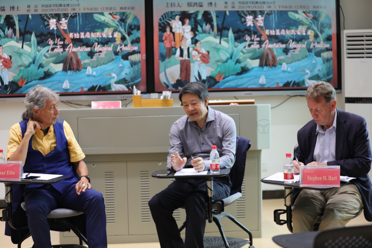 (通讯员 李亦萱 朱湘黔)5月30日下午,我校三位“潇湘学者”特聘教授Ottmar Ette教授,陈众议教授和Stephen Hart教授在腾龙楼404智慧教室围绕“莫言与拉美魔幻现实主义”展开对谈,交流学术理念、传递人文思想。对谈由欧阿语系负责人邢鸿儒博士主持,对谈工作语言为西班牙语并面向省内兄弟院校西班牙语专业师生开放,吸引了来自中南大学和湘潭大学的青年学者前来聆听和学习。