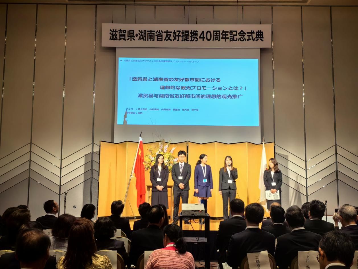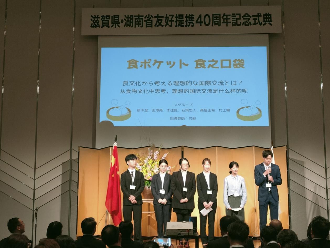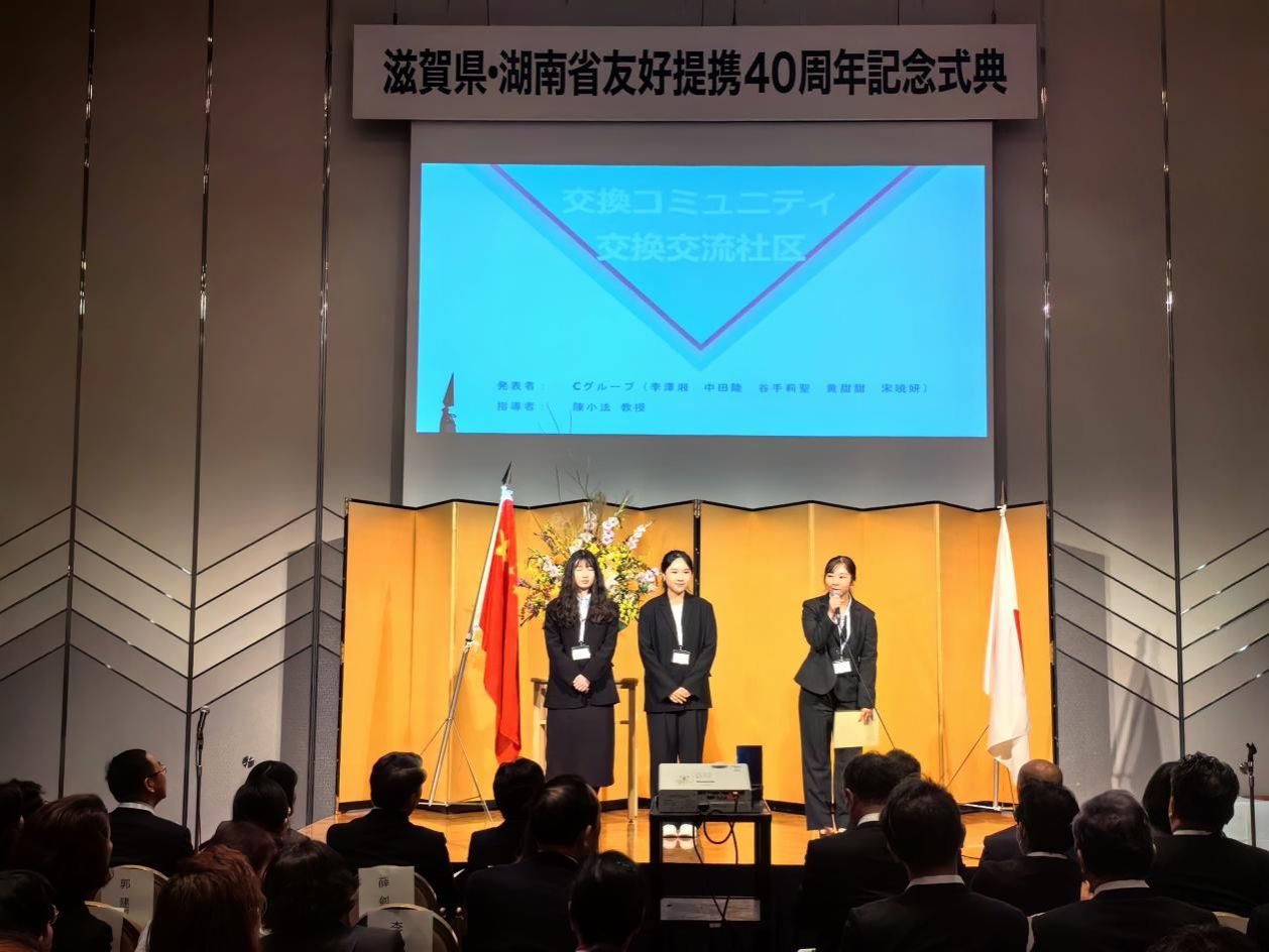 在纪念典礼的青年大学生成果交流发表环节,澳门pg官网2021级日语专业本科生兰大进、2022级国别与区域研究专业硕士研究生李泽湘、2022级日语语言文学专业硕士研究生李佳钰在澳门pg官网日语系主任陈小法教授、日语系冉毅教授等指导下,围绕“滋贺县与湖南省友好都市间的理想的观光推广”“滋贺县理想的民间交流形式:交换交流社区”“从食物文化中看理想的国际交流”等话题展开了生动的成果分享。吴桂英书记、三日月大造知事等与会领导、来宾对澳门pg官网青年学子的精彩发言予以了充分肯定。