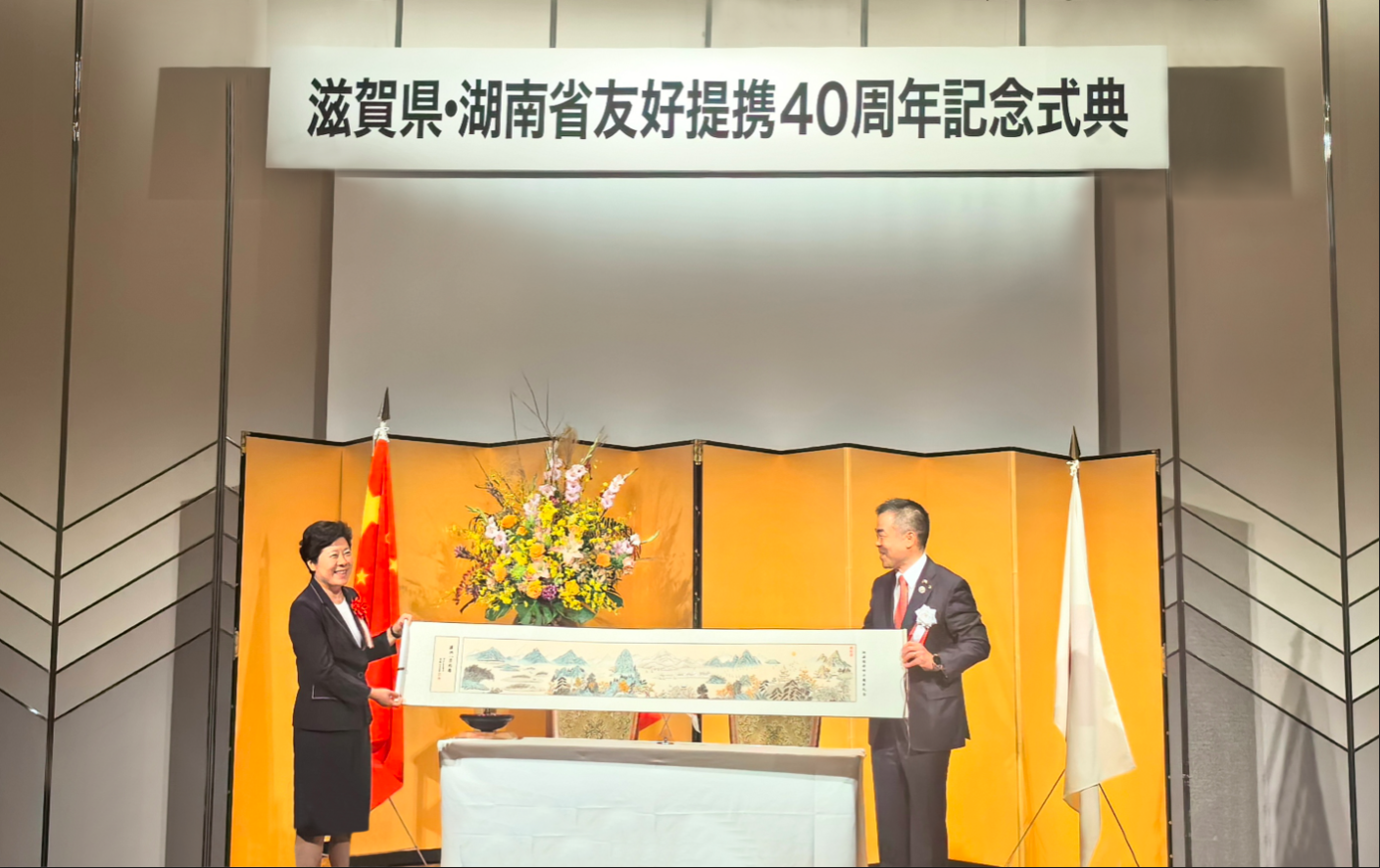 11月10日至11日,省委常委、市委书记吴桂英代表湖南省委、省政府率团访问滋贺县,与滋贺县知事三日月大造会谈,并共同出席湘滋结好40周年庆典等活动。其间,澳门pg官网专家研发的“潇湘八景”国家级非遗湘绣长卷等作品被遴选为湖南省人民政府定制礼品赠予滋贺县政府。