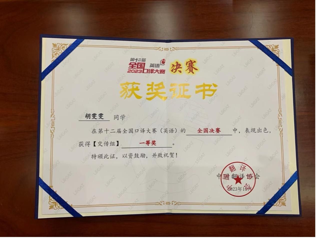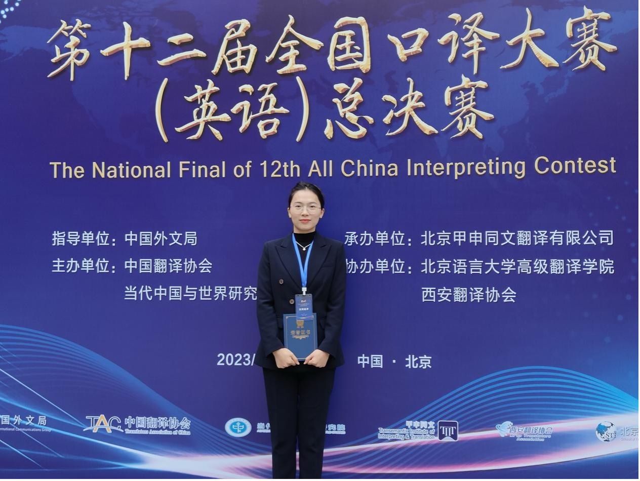 在第十二届全国口译(英语)大赛的总决赛中,澳门pg官网2021级翻译硕士胡雯雯(指导老师:蒋莉华)以其出众的表现,从8000多名选手中脱颖而出,成功挺进全国百强,并最终荣获全国一等奖,实现了学院在此赛事中新的突破。胡雯雯在比赛中展现了大方稳健的台风,她的现场传译工作流利且准确,赢得了来自外交部、外文局以及中国翻译协会中外专家的一致认可和赞誉。