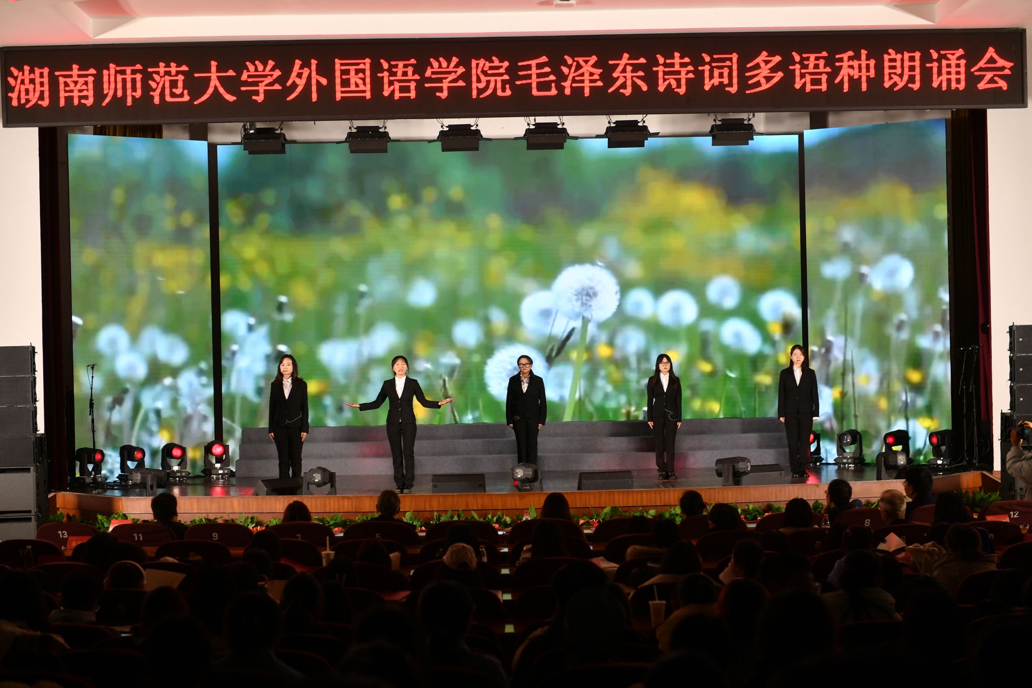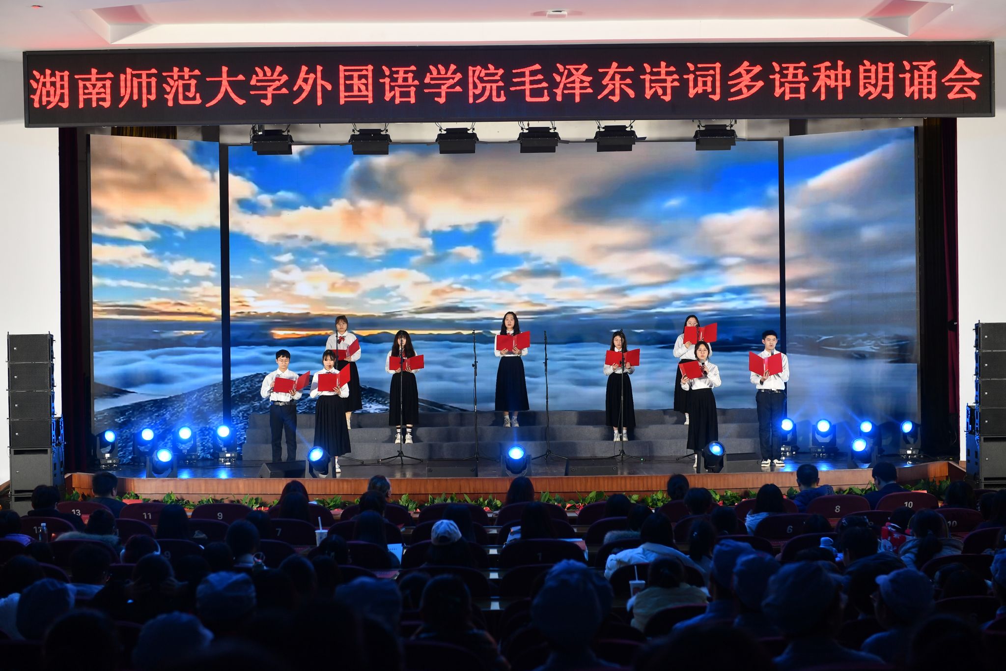 (通讯员 吴黛琳)12月21日晚,学院在国际学术报告厅举办纪念毛泽东同志诞辰130周年·毛泽东诗词多语种朗诵会。院长曾艳钰,院党委副书记李蜜,副院长刘白、蒋莉华、梁斌出席观看。活动由2022级比较文学与跨文化研究专业硕士研究生胡云天、2022级英语专业本科生韩佳琪主持,来自各专业、各语种的200余名本科生、研究生和留学生参与朗诵会演出。