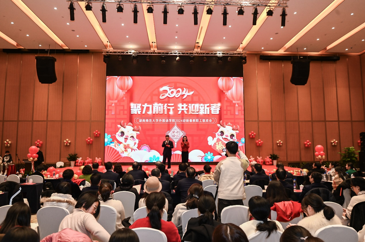 会后,学院以“聚力前行 共迎新春”为主题举办了教职工联欢会,侯奇焜、邓元老师主持。学院教授代表、工会各小组呈现了混声合唱《在银色的月光下》、独舞《国色:水袖与剑》、女声小合唱《Scarborough Fair》等节目,用歌声和舞蹈带来美好的祝愿。联欢会在合唱《明天会更好》中落下帷幕。