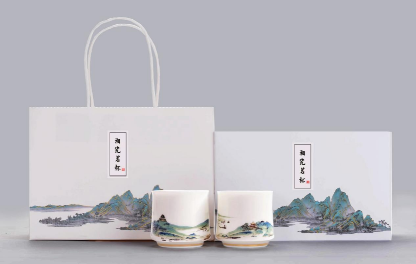 团队基于中国湖南省、日本滋贺县结缘的胜景——洞庭湖、琵琶湖以及两湖畔屹立的岳阳楼与彦根城展开设计,在晶莹剔透的白瓷双盏杯上呈现出两省县自然、人文的代表性元素。“湘瓷茗杯”高6厘米,直径6.5厘米,以白瓷为载体,釉下五彩为表现形式,采用德国进口金水、手工描绘,经1330度以上高温烧制,其胎骨细柔坚致,温润如玉,剔透光滑,器体在光线照耀下,可映见指影,叩之其音清悦悠扬,犹如敲击金属,铿然作响。作品体现了“文明互鉴、创新融合、合作共赢”的主题理念,象征美美与共,和而不同。