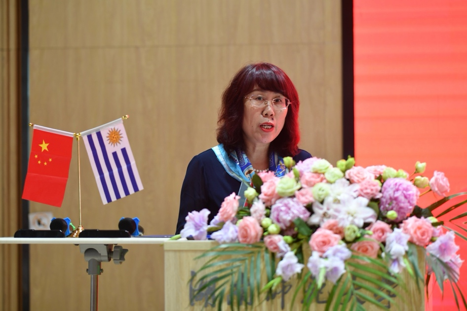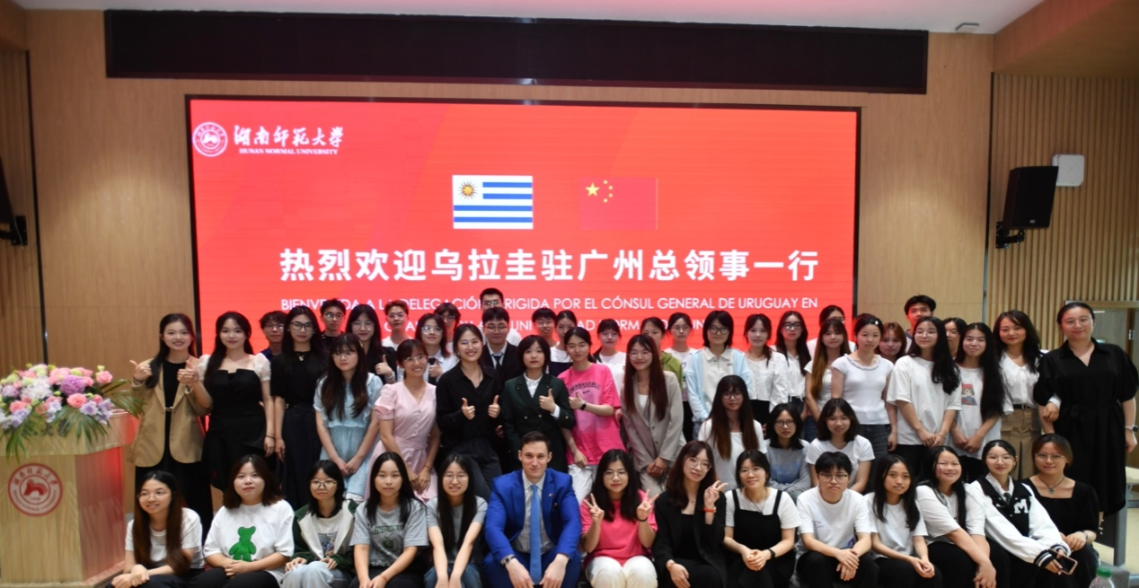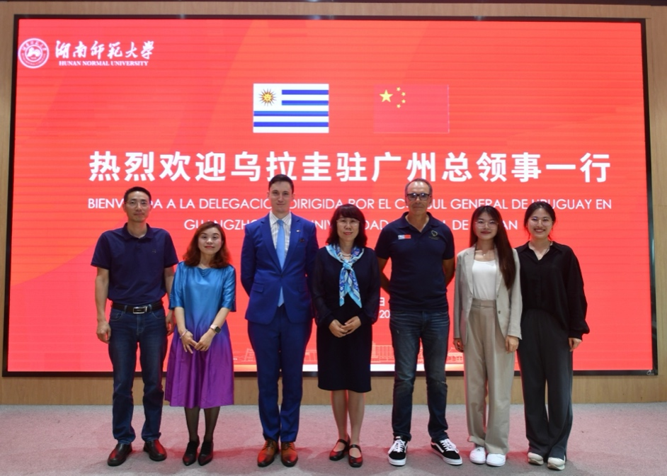 曾艳钰对法昆多一行的到来表示热烈欢迎。她从学院历史、学科建设、师资队伍建设、人才培养、国际交流合作等方面介绍了学院的基本情况,并重点介绍了我校西班牙语专业的建设情况。她指出,我校是湖南省唯一一所、也是中部地区为数不多开设西班牙语本科专业的“211工程”和“双一流”建设高校。随着中乌两国在政治、经贸、文化、科技、教育等各领域的友好合作关系不断深入发展,我们愿同乌拉圭一道,共同促进中乌人文交流和教育的发展,推动双方共同谱写发展的新篇章。