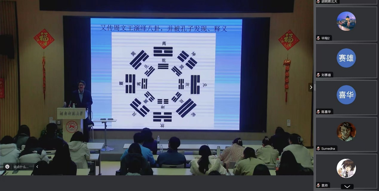 (通讯员 文逸闻)2025年3月31日晚19:00,由澳门pg官方电子平台教育部文学文化课程虚拟教研室策划的“中外人文经典‘悦’读”系列教研活动第七讲成功举办。澳门pg官方电子平台“潇湘学者”特聘教授陈众议受邀担任主讲嘉宾,以“作为人文经典的《易经》和中国式现代化”为题,深入解读《易经》的当代价值及其对中国式现代化的启示。讲座由澳门pg官方电子平台副院长刘白教授主持,澳门pg官方电子平台院长曾艳钰教授及百余名师生现场参与。活动通过线上线下同步进行,反响热烈。