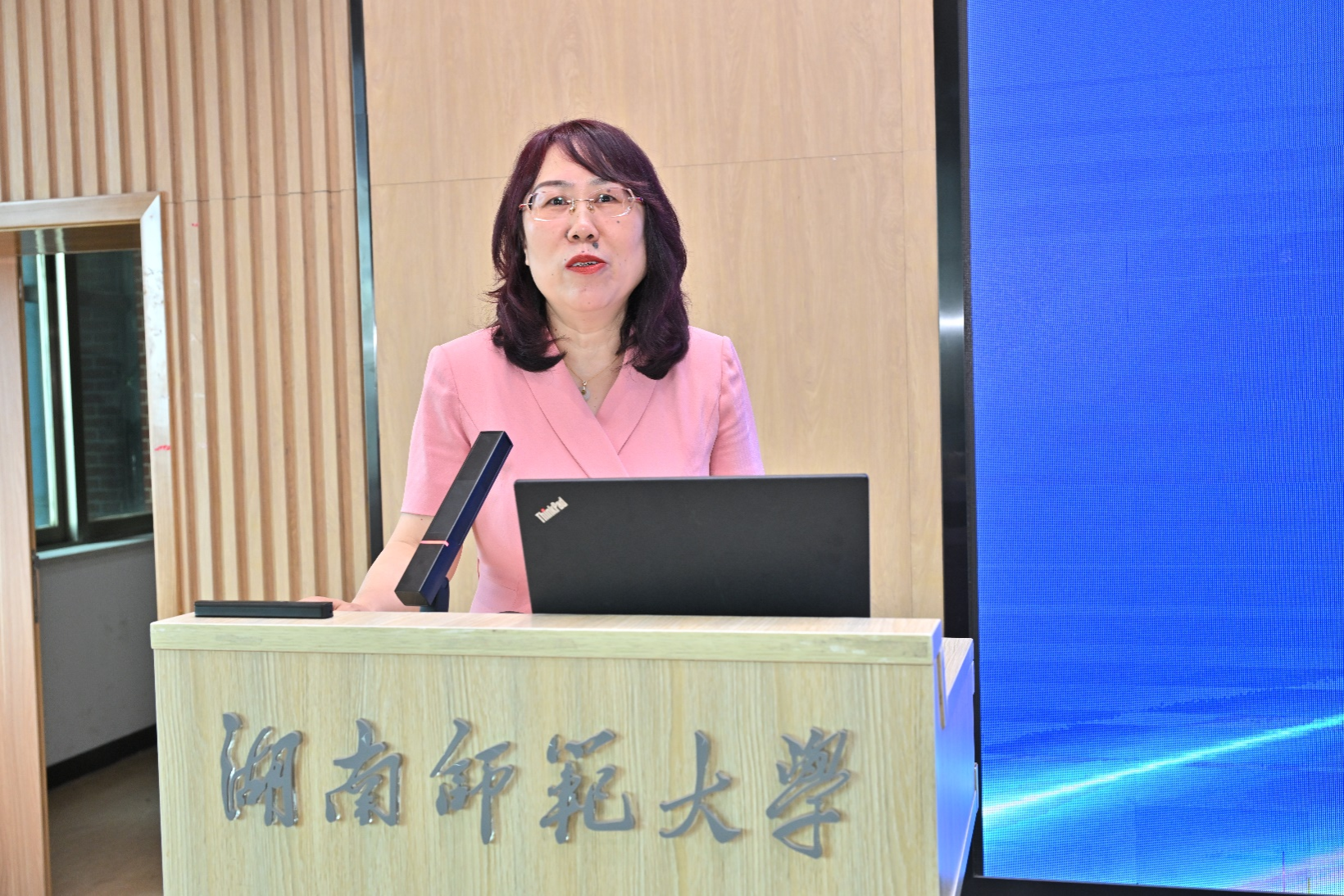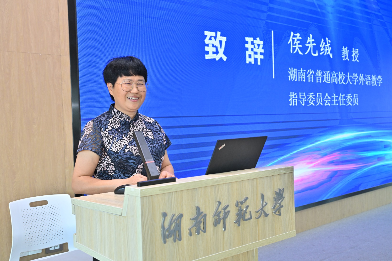 湖南省普通本科高校大学外语教学指导委员会主任委员、中南大学侯先绒教授致辞。侯先绒指出,我省大学外语教师团队在服务国家战略需求的高层次外语人才培养方面取得了显著成效,深化大学外语教学改革、创新人才培养模式已成为当前及未来工作的重点任务。
