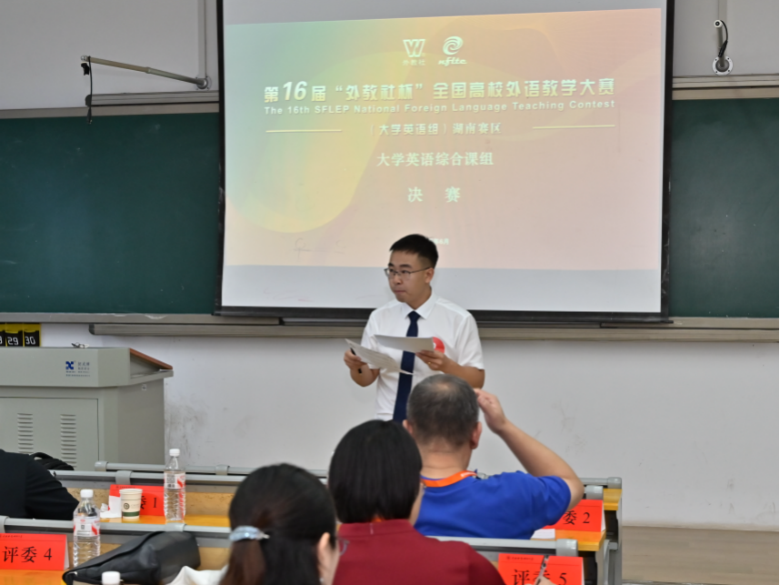 本次比赛由湖南省普通本科高校大学外语教学指导委员会与上海外国语大学共同主办,中南林业科技大学与上海外语教育出版社承办,吸引了包括国防科技大学、中南大学、澳门pg官方电子平台等高校30余名优秀选手参赛。比赛分复赛(21日)与决赛(22日)两个阶段。复赛为20分钟授课,选手需就抽签材料进行教学设计,现场进行课程设计阐释与有生课堂授课;复赛成绩前35%者晋级决赛。决赛分为说课与问答评委提问,选手需在30分钟内阅读一篇800词左右的选文,随后进行10分钟教学设计阐释并回答评委5分钟的提问。赛事日程紧凑、挑战性强,对选手的教学素养、专业能力和应变能力要求极高。李亚文老师在复赛中对单元教学设计的阐释清晰全面、详略得当,基于SPICM模式和TED流程开展的课堂教学颇具匠心,巧妙处理“LanguageLearning”这一教学素材,展现了语言魅力及语言文化并蒂双生的深刻内涵,以复赛第二名的成绩晋级决赛。决赛中,他稳定发挥、保持领先,最终摘得一等奖。