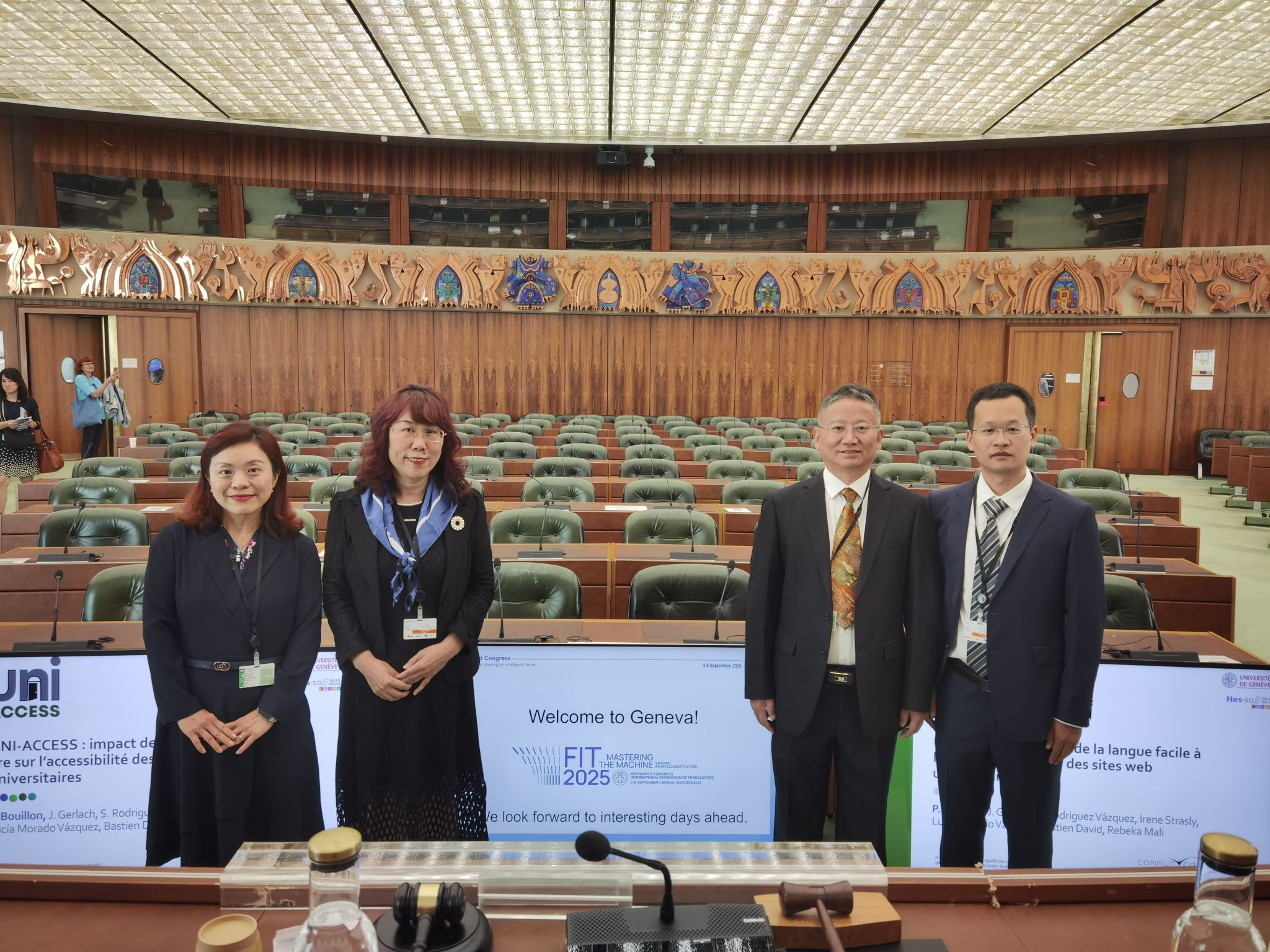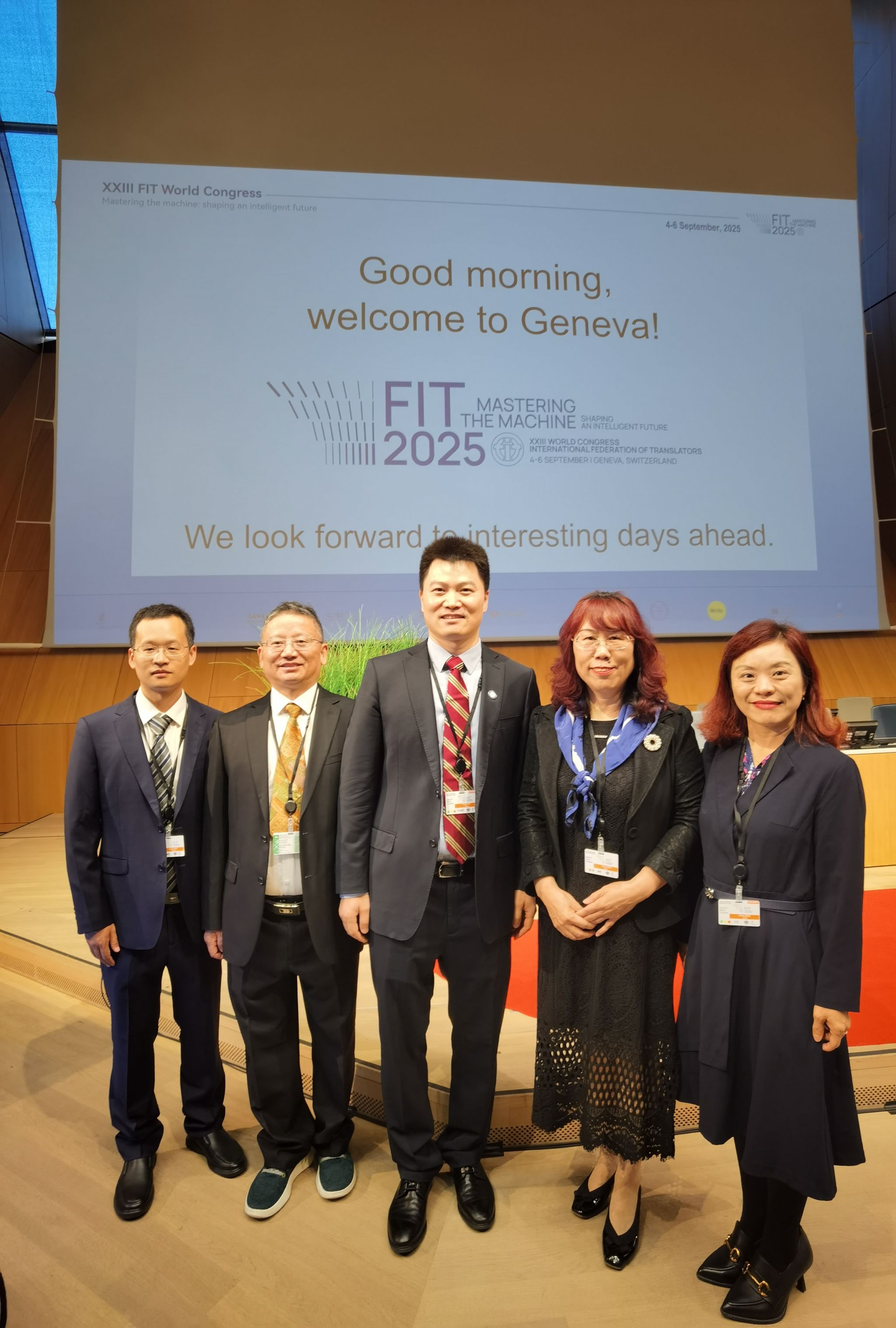 9月3日至8日,受中国翻译协会和国际译联邀请,学院院长曾艳钰教授、副院长蒋莉华教授、人工智能与精准传播实验室高协平教授和曾道建副教授赴瑞士日内瓦参加国际翻译家联盟(FIT)第二十三届世界大会,并访问世界知识产权组织(WIPO)及瑞士UMEF大学,推进学术合作与人才培养交流。
