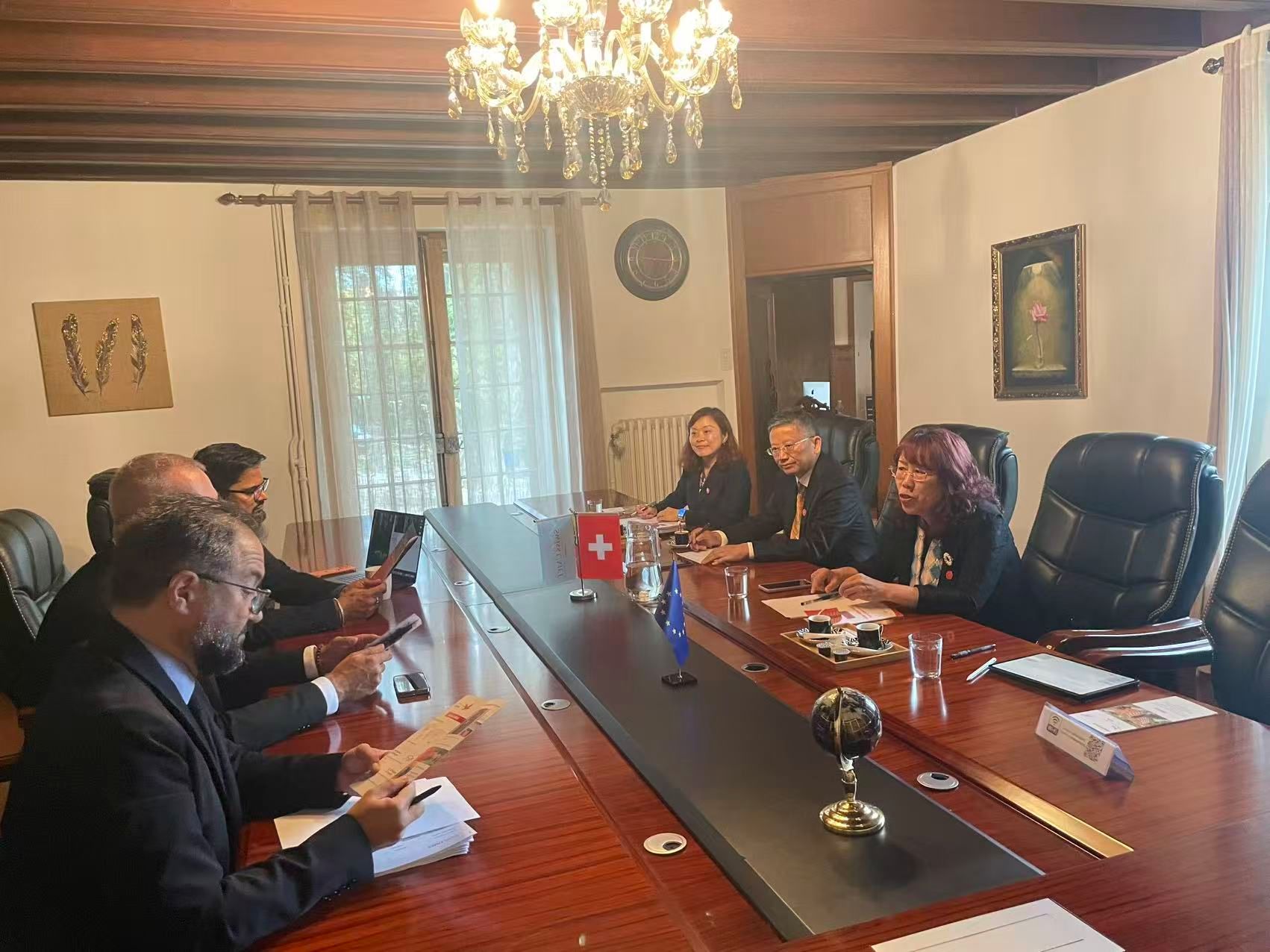 9月8日上午,代表团访问瑞士UMEF大学日内瓦校区,与副校长兼教务长DidierGarzotto教授、学生处处长Dimitrios Koukourdinos教授、数字培训部主任Sunil Kumar教授进行了学术交流。曾艳钰回顾了两校既有的合作基础,并围绕区域国别人才培养、精准国际传播联合实验室建设、暑期短期项目合作等提出具体建议。双方同意尽快落实学生交换、教师互访和科研协同等机制,共同打造中瑞教育合作新平台。