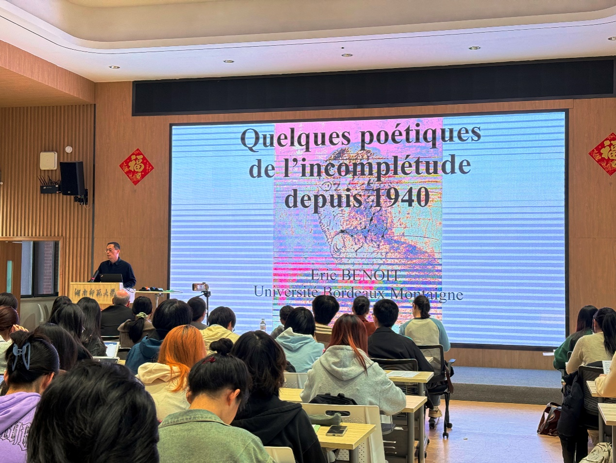 (通讯员 史晓晴 王淮星 曹雪 仲佳洁 易雨婷)11月6日,法国波尔多蒙田大学埃里克·伯努瓦(Éric Benoit)教授应澳门pg官网法语系学术带头人张弛教授的邀请,在腾龙楼613报告厅举办了一场生动而深刻的学术讲座。本次会议由张弛教授主持。法语系全体硕博研究生、本科生以及部分教师共同参与了此次学术交流活动。讲座历时近三小时,期间,参会师生始终保持高度专注,沉浸于浓厚的学术氛围之中。