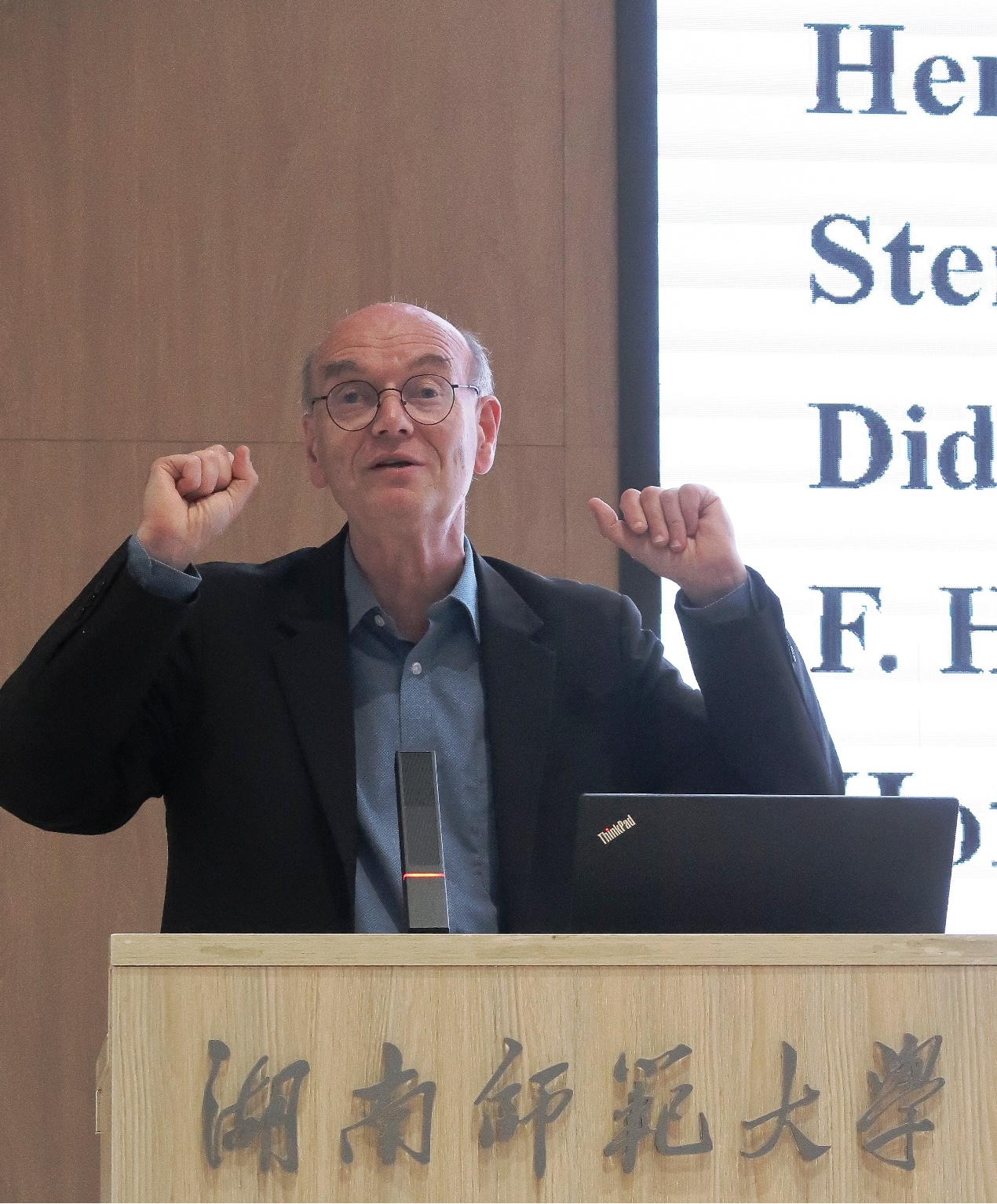 为了便于低年级本科生理解,张弛教授对伯努瓦教授讲座的逻辑架构进行了系统梳理。他把讲座内容与当代社会现实相融合,强调在呈现为碎片化与无序化特征的当下,我们应当秉持理性,于不确定性中探寻确定性,于无序状态中重新构建秩序。张弛教授朗诵了他即兴创作的七言绝句《长沙重逢埃里克·伯努瓦教授》,以纪念与伯努瓦教授的深厚情谊以及九年后的再度相逢,希望大家在人工智能与技术猛进的时代,仍然把人文情怀和人文精神放在首位。