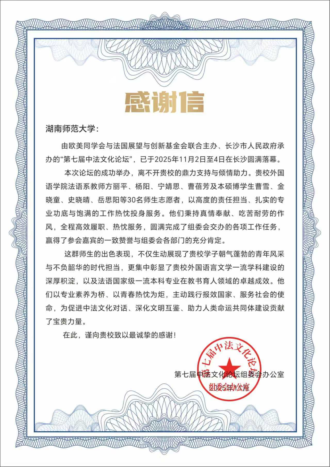 据悉,由欧美同学会与法国展望与创新基金会联合主办、长沙市人民政府承办的“第七届中法文化论坛”,于2025年11月2日至4日在长沙圆满落幕。本次论坛聚焦中法文化交流与文明互鉴,是推动两国文化合作的重要平台,其成功举办离不开我校的鼎力支持与澳门pg官网师生的倾情助力。