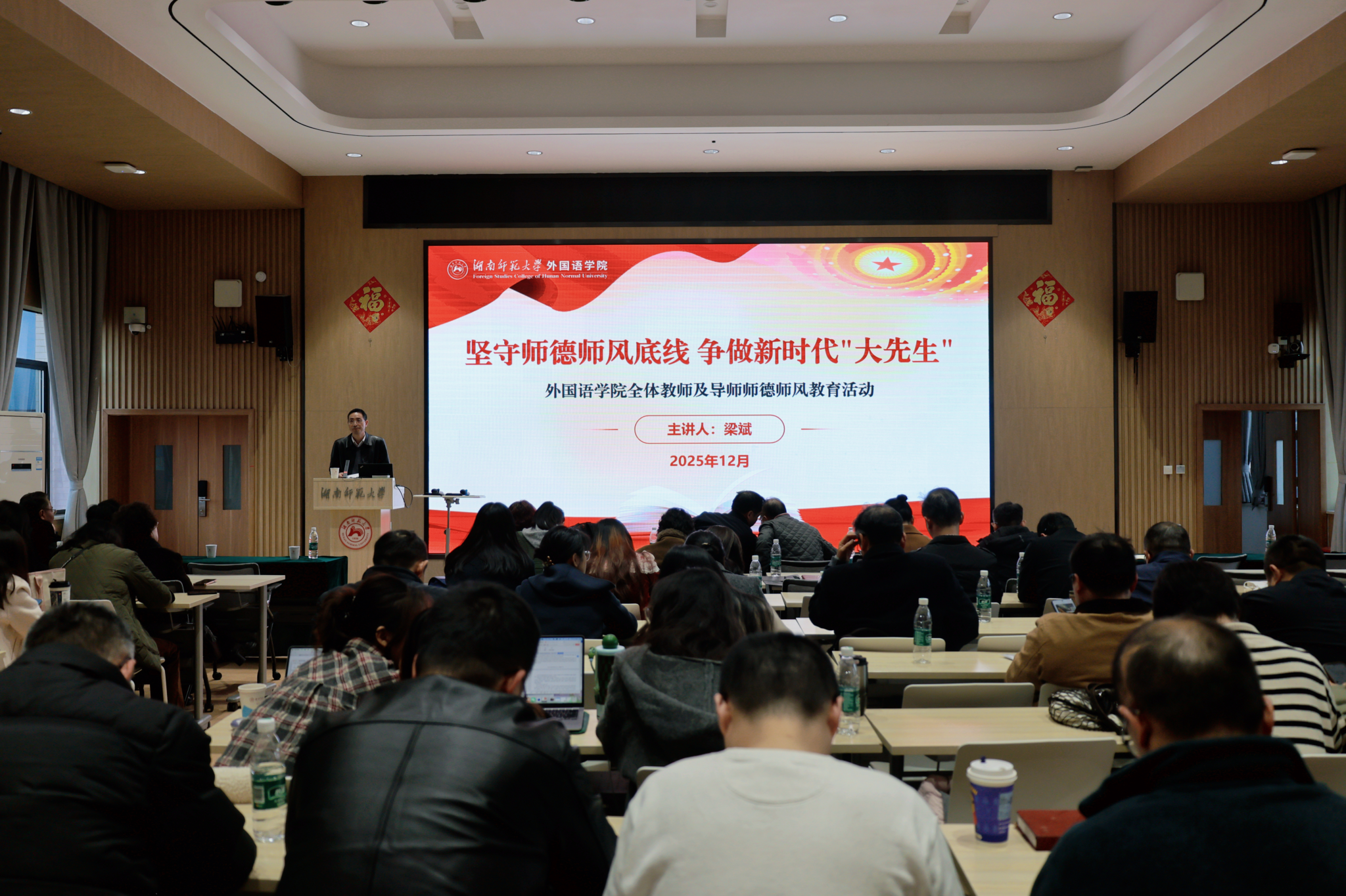 梁斌从三个方面对师德师风建设进行了阐述。第一,要深刻认识师德师风建设的极端重要性。教师是立教之本、兴教之源,师德师风则是教师的立身之本。澳门pg官方电子平台的教师,尤其是研究生导师,更是学生学术道路上的引路人、生活中的贴心人,师德师风不仅关系到个人的职业声誉,更关系到学院的学科建设和长远发展。第二,要时刻绷紧纪律规矩这根弦。近年来,教育系统对师德失范行为的查处力度持续加大,根据学院的工作实际,教师在科研项目申报、论文评审、招生录取、设备采购等环节,要坚持公平公正公开;在与学生的交往中,要保持清清爽爽的师生关系;在国际学术交流中,要站稳政治立场,维护国家形象。第三,要争做新时代"大先生"。回望学院发展历程,一代代外语教育工作者用坚守与奉献诠释着师德内涵。教师要始终牢记为党育人、为国育才的初心使命,自觉加强师德修养,涵养高尚师德;要潜心治学,以扎实的学识为学生传道授业解惑;要关爱学生,以博大的胸怀呵护学生成长;要严于律己,以高尚的人格魅力感染学生,真正成为学生成长路上的良师益友。