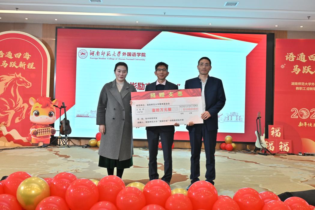 联欢会还巧妙穿插了以马到成功为主题的“龙马精神 吸战到底”、“一马当先 筷乐套杯”、“万马奔腾 马跃三彩”、“马不停蹄 并驾齐驱”四个趣味横生的团队游戏,各工会小组教师积极参与,默契配合,现场欢笑不断,气氛热烈。马报平安、马年吉祥、马到福来三轮满载情谊的抽奖,一次次将晚会推向欢乐的高潮,这些饱含情谊的奖品,均来自全国各地校友们的慷慨捐赠。会上还播放了多位校友发来祝福视频与新年贺信,传递着对母校的深厚情谊。联欢会在温馨、欢乐、热烈的氛围中圆满落幕。