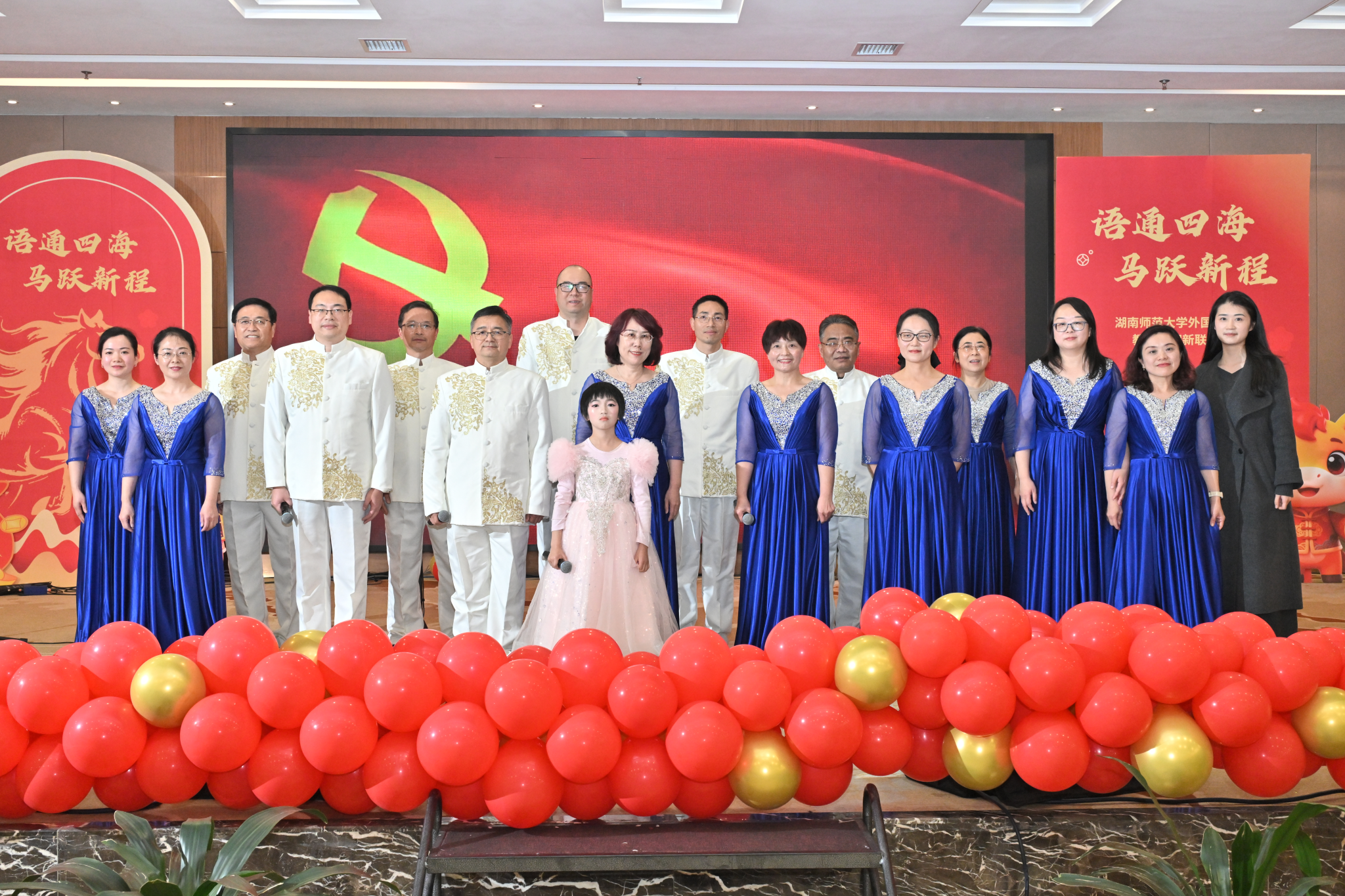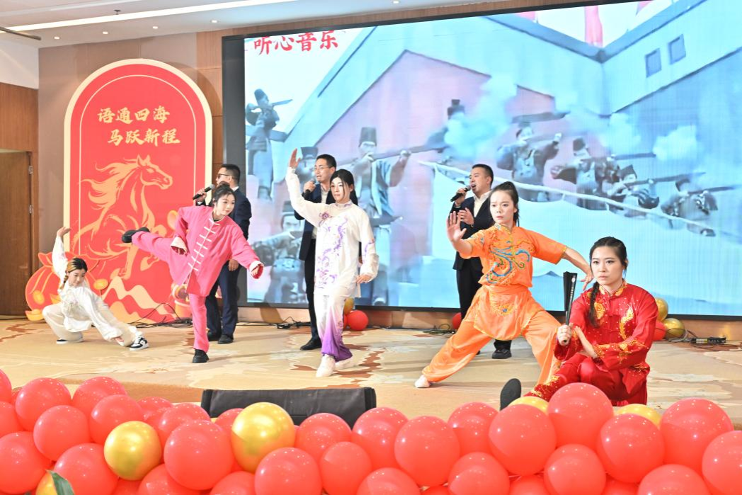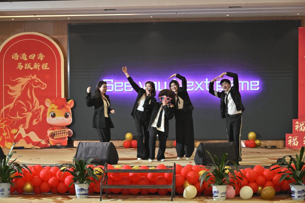 总结大会之后,现场灯光转换,喜庆的音乐响起,“语通四海 马跃新程”2026年迎新春联欢会在四位主持人马纳克、马琳、赵玉砚、胡云天热情洋溢的开场中正式拉开帷幕。