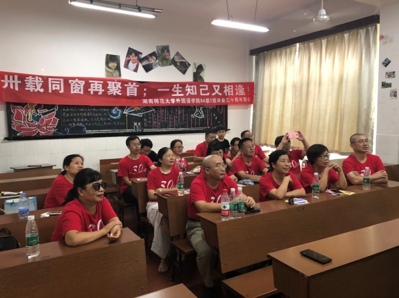 7月17—18日,澳门pg官网英语语言文学专业84级3班校友回到阔别多年的母校,共庆毕业三十周年。虽然7月的长沙格外炎热,但炎炎的烈日无法阻止校友们相聚的步伐,校友们从天南地北来了,最远的自中国驻巴西大使馆。同学们回到校园,回到曾经上课的教室,追忆同窗往事,畅谈人生感悟,展望美好未来。17日晚,同学们最敬爱的白解红老师接见了同学们并与同学们畅谈师生情谊。