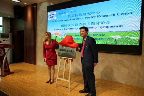澳门pg官方电子平台校长蒋洪新教授和“潇湘学者”Lauri Ramey 教授共同为中心揭牌。湖南省诗歌学会会长梁尔源简要介绍了新诗发展现状,他指出,英美诗歌研究中心的成立,标志着湖南师大教育向国际文化纵深开放迈出了坚实一步,是实践习近平总书记提出的构建人类命运共同体倡议,也是一个中国和英美文化交流、融合丶互鉴的高层次平台。不仅是中国诗歌发展的迫切需要,更是湖南文学诗歌界和教育界的迫切需要。他表示,湖南诗歌学会将高度重视和支持研究中心的工作,并和中心携手共同开展一些富有成效的研究交流项目。