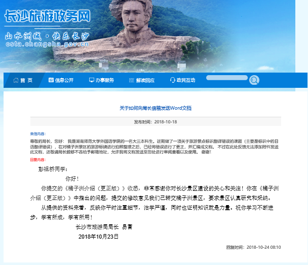 经过交流沟通后,得到长沙市旅游局与岳阳楼旅游发展与外事侨务委员会正式回复。在回复邮件中,长沙旅游局局长易冒、岳阳楼景区管理处主任方争奇对我们小组所做工作作出充分肯定,并表示会对我们的建议进行研究和采纳。同时,也对我们对于景区的关心表示感谢并提出殷切希望,希望我们大学生能继续发扬善于观察生活的优良品质,保持投身学术研究的热情,共同将景区水平提高到新的台阶。