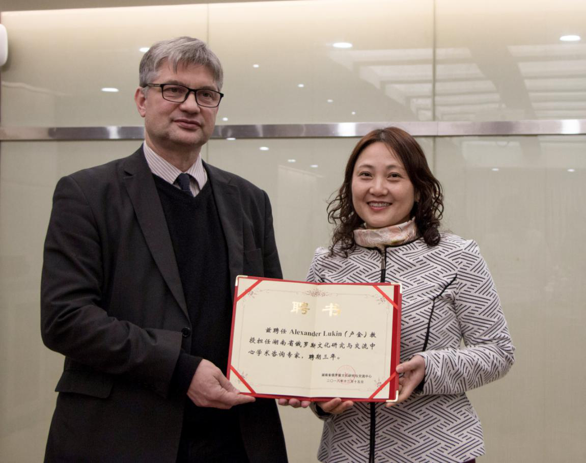 首先,东北亚研究中心主任蔡美花教授与湖南省俄罗斯文化研究与交流中心李兰宜副教授分别向卢金教授颁发“东北亚研究中心学术咨询专家”聘书、“湖南省俄罗斯文化研究与交流中心学术咨询专家”聘书。卢金教授对此表示感谢,并承诺自己将会努力工作,不负所托。