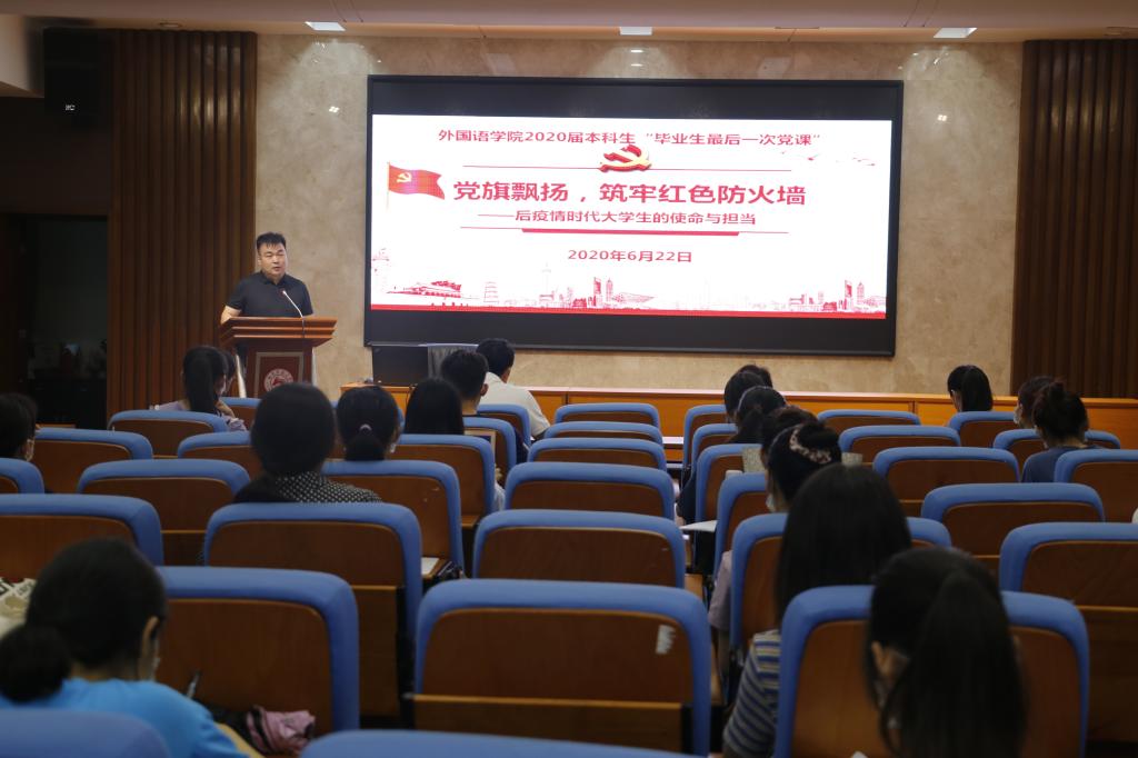 (通讯员:舒怡 杨兆晨)6月22日晚,澳门pg官网在515报告厅举办以“党旗飘扬,筑牢红色防火墙——后疫情时代大学生的使命与担当”为主题的本科毕业生党员最后一堂党课。学院党委书记唐建文、副书记贺慧星,学工办全体老师和2016级毕业生党员、预备党员一同参加了此次“特殊”的党课。