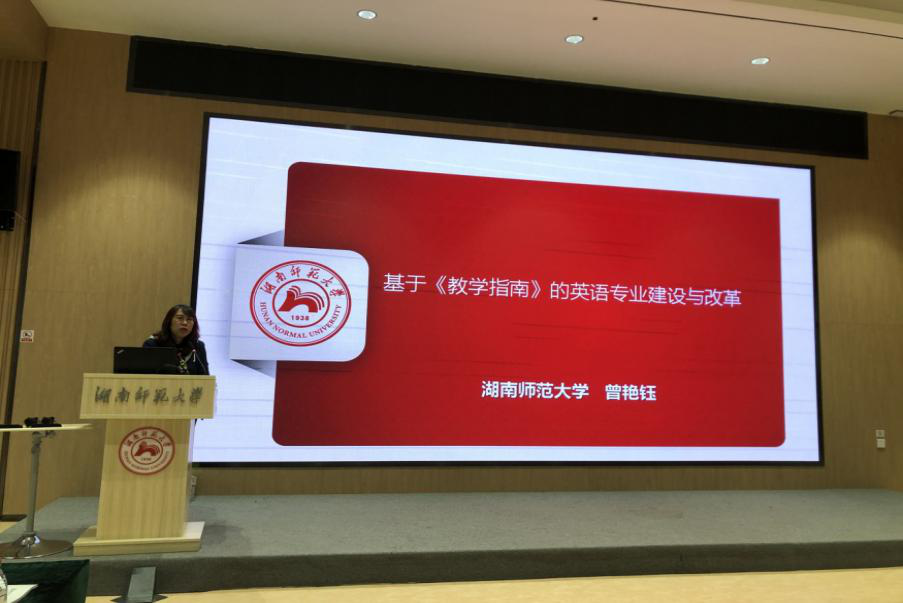 曾艳钰教授以“基于《教学指南》的英语专业建设与改革”为题做主旨讲话。她从课程思政与外语类课程的结合、专业与学科融通两个方面对《英语类专业教学指南》进行《教学指南》解读,并对英语专业建设与改革分享了自己的思考。