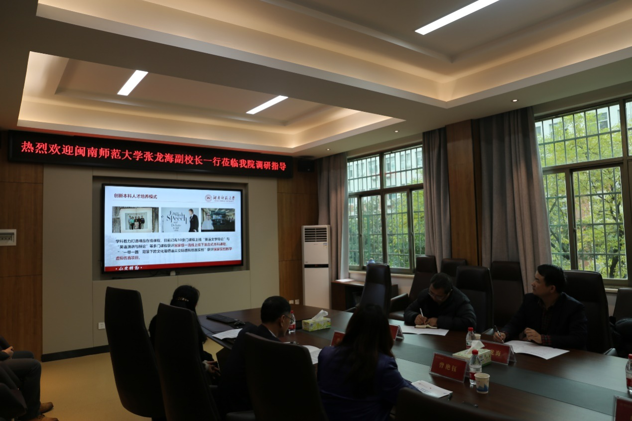 12月18日下午,闽南师范大学副校长张龙海率澳门pg官方电子平台副院长钟惠芸、学报编辑部主任王照年和校办督查科沈晓杰等来澳门pg官网调研,调研座谈会在腾龙楼204会议室举行。院长曾艳钰,副院长高荣国、司徒皓,英语系主任陈敏哲,杂志编辑部主任任海燕出席会议,座谈会由院党委书记唐建文主持。