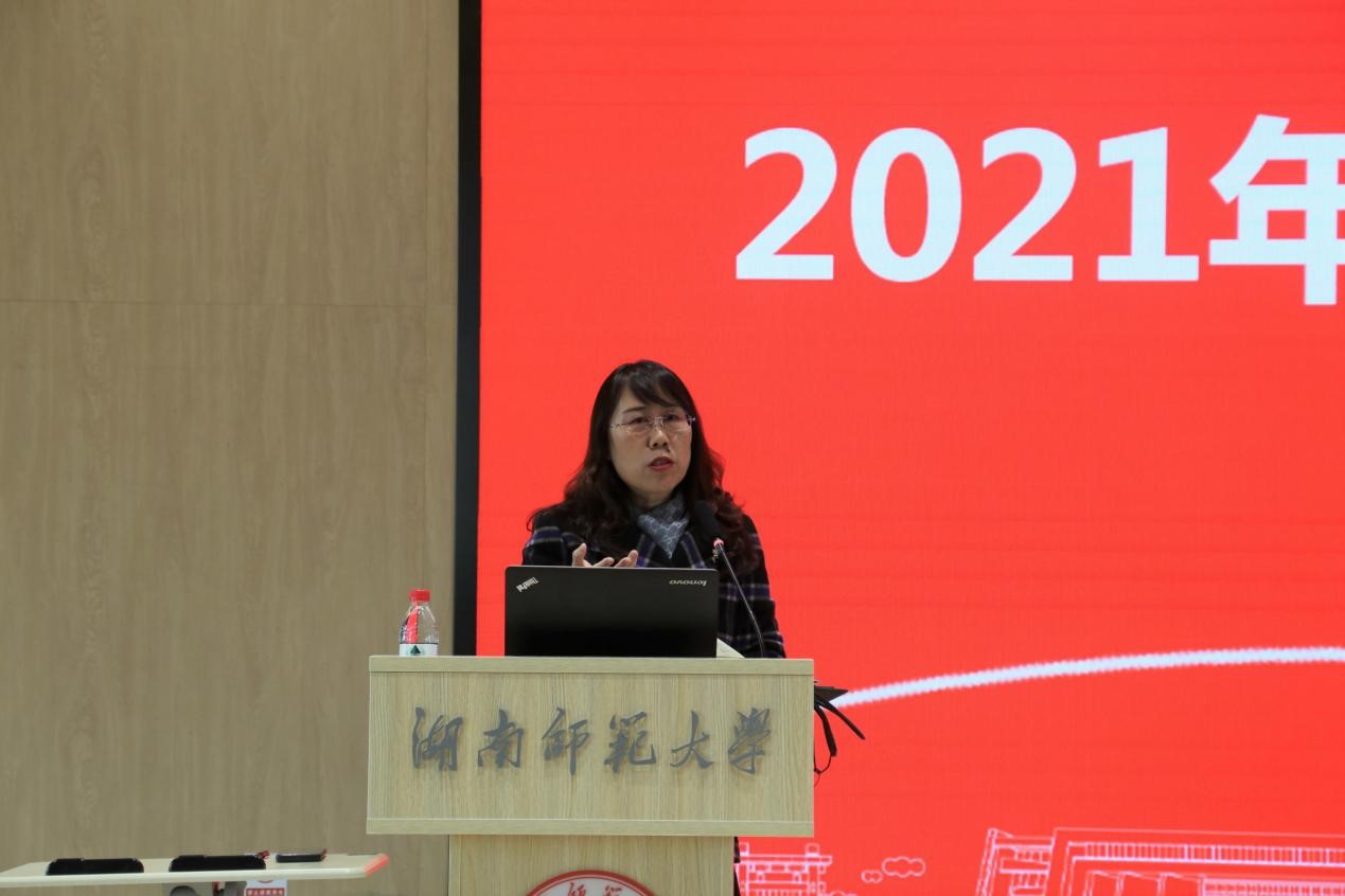 曾艳钰首选传达了学校会议精神,然后总结了学院去年工作主要成就,并对全院师生的辛勤付出表示衷心感谢。她表示新学期学院将围绕学校工作大局,推进四个方面重点工作:一是大力推进人才培养模式改革,在新高考背景下要超前谋划,做好培养方案,加强招生宣传;各系与学院职能科室之间要做到互联互通,争取在国家级一流专业、一流课程上取得新突破。二是要加强师资队伍和工作团队建设,要进一步凝练学科发展方向,大力引进师资和优秀人才。三是高度重视科学研究和社会服务,坚持学科发展与社会服务相融合,把论文写在祖国大地上,发挥一流学科的重点推进作用,围绕乡村振兴继续加强基础教育、外语教育发展。四是做好学院“十四五”规划编制,把事关学院发展全局的重大工作、重要项目融入到“十四五”规划中去,为学院描绘好发展蓝图,书写好高质量发展新篇章。她希望全院师生继续保持拼搏、奋进、奉献的精神风貌,发扬“三牛”精神,推动学院各项工作迈上新台阶。