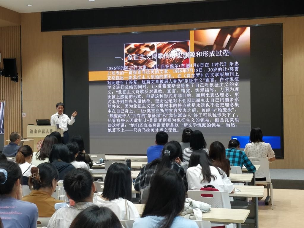 (通讯员 刘宇然 方丽平 肖茜)6月3日下午,西安外国语大学前校长、中国人民对外友好协会原副会长、第十三届全国政协常委、民革中央委员会常委、教育部高校外语专业教学指导委员会法语分委员会副主任委员户思社教授做客澳门pg官网“潇湘法语讲坛”,在腾龙楼613多功能厅为澳门pg官网法语系师生做题为《法国象征主义诗歌的起源和演变》的学术讲座。讲座由澳门pg官网法语系特聘教授吴泓缈主持。