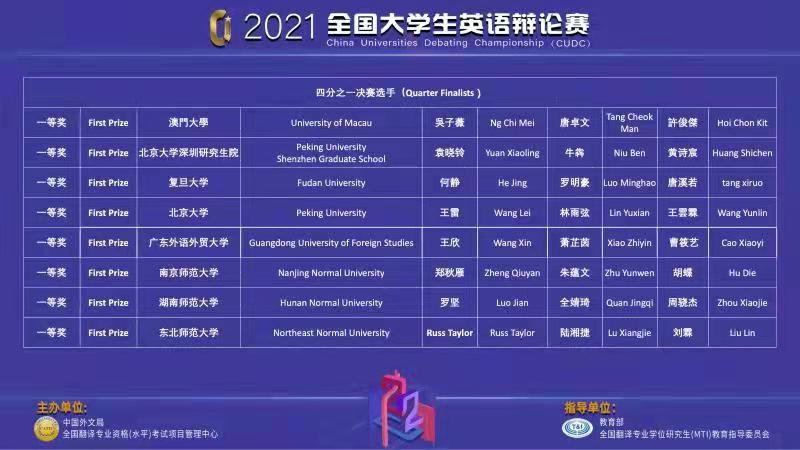 在“2021全国大学生英语辩论赛”中,由澳门pg官网2018级学生全婧琦、周骁杰组成的澳门pg官方电子平台代表队获得全国总决赛一等奖,英语系罗坚担任指导老师。