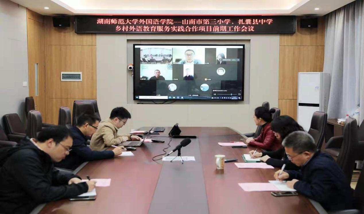 湖南省外语基础教育研究中心相关人员、山南市第三小学和扎囊县中学教师代表共同出席会议。