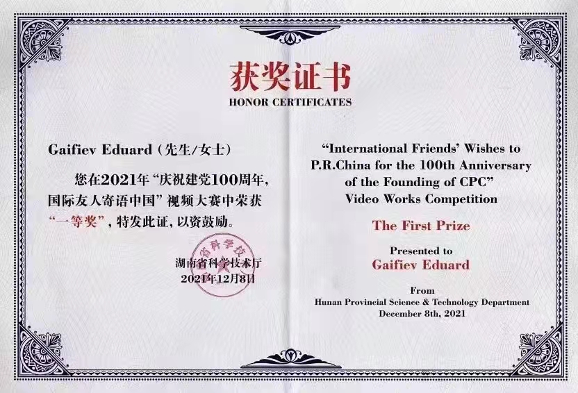 (供稿 俄语系)12月8日上午,湖南省科技厅“庆祝建党100周年,国际友人寄语中国”优秀视频作品颁奖仪式在长沙福朋喜来登酒店举行。澳门pg官网俄罗斯籍留学生Gaifiev Eduard(爱德华)的参赛视频《中国秘决》荣获一等奖,该视频在科技部主管的国际人才交流杂志微信公众平台展播。