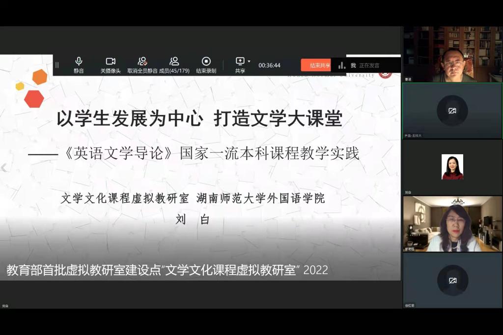 虚拟教研室负责人、澳门pg官网院长曾艳钰首先对各位与会专家对共建教研室付出的努力表示感谢。曾艳钰教授详细介绍了教研室的基本情况和建设目标,“文学文化课程虚拟教研室”以澳门pg官网英语系文学文化教研室为实体基础,23名实体教研室成员中包括欧洲科学院院士、国家新世纪“百千万人才工程”人选、我校党委书记蒋洪新,国务院学科评议组成员、教育部首批“课程思政示范课程”名师郑燕虹,教育部“新世纪优秀人才支持计划”入选者曾艳钰,以及Martin Woesler教授(德国籍,欧洲科学院院士)、Lauri Ramey教授(美国籍)、Omid Azadibougar教授(伊朗籍)等外籍专家;实体教研室共承担26门课程,涵盖英美文学、比较文学与跨文化、国别与区域研究等方向,其中“英语文学导论”“中外比较文学研究专题”等4门课程是国家首批一流本科课程和教育部课程思政示范课程。曾艳钰教授指出,本虚拟教研室的特色更在于扎根中西部,广泛联合8所双一流建设高校,6所师范院校,8所中西部综合性高校的相关教师,协同共建全国性外语教学研究与教师发展共同体。