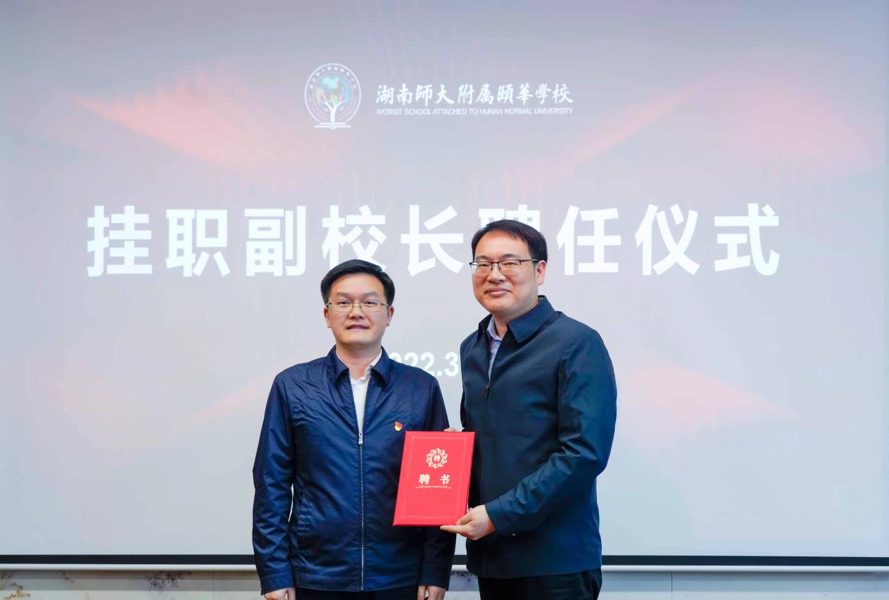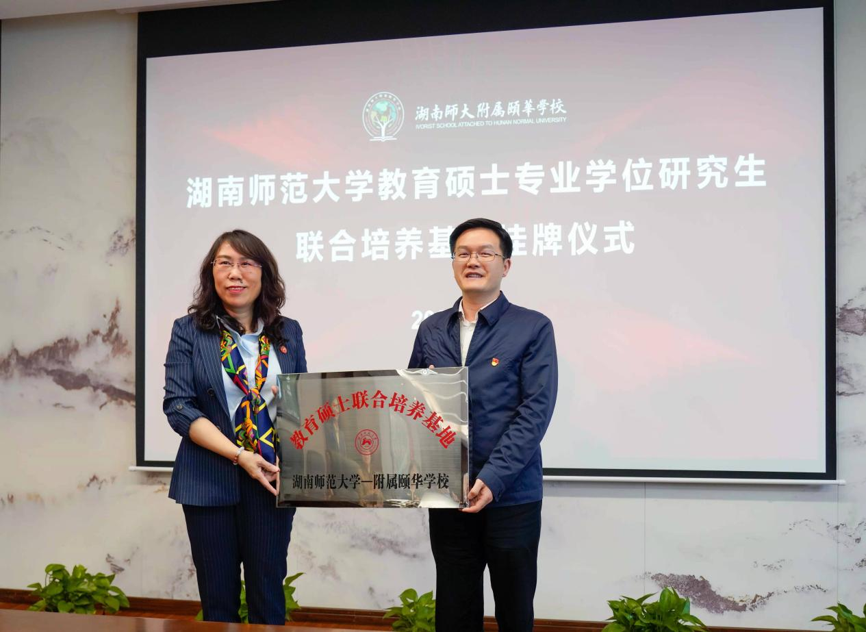曾艳钰为“教育硕士联合培养基地”师大颐华学校授牌,彭荣宏接牌。仪式上还举行了挂职副校长聘任仪式,彭荣宏为澳门pg官网吴驰副教授颁发师大颐华学校副校长聘书。