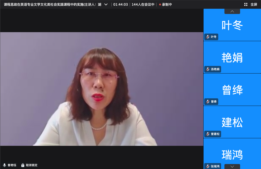来自贵州大学、同济大学和长春师范大学的教师积极进行了提问并参与讨论,杨安博士和曾艳钰院长在回答中与他们深入研讨并进一步分享。曾院长依照自己的授课经验提出,每一堂课都有挖掘育人要素的潜能,就文学文化类的理论课程而言,教师应当通过一种比较研究的方式开展,并在课堂给学生提前设问,让学生自主探索答案进行实践。杨安博士提出英语专业教师一方面要持续学习,关注教师自身的主体动力,另一方面要贯彻跨界融通的理念并注重课程的反馈评价。