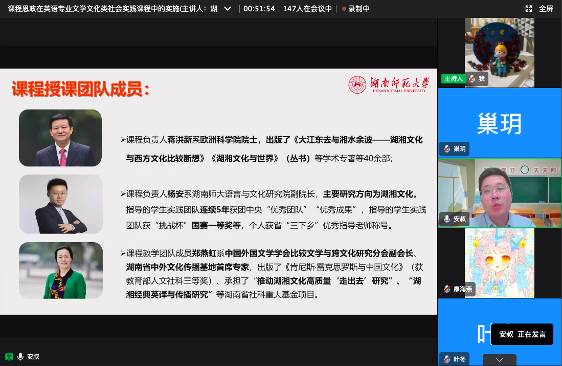 杨安博士本次研讨的主题是“课程思政在英语专业文学文化类社会实践课程中的实施”。课程思政的实质是一种课程教育观,是“课程承载思政,思政寓于课程”的理念和方法。英语专业本身就蕴含着丰富的思政元素,英语专业的教学目的就是借助语言文化作为载体,呈现人文知识、艺术潮流和思想的传承传播,为人类认识和改造世界服务。近年来,澳门pg官方电子平台学科深入贯彻教育部一流本科课程“双万计划”精神,立足学科属性和办学特色,开设了“湖湘文化传承传播”、“文学翻译实践”、“湖湘文化术语英译及数据库建设”等多门社会实践课程,取得了一定成效。杨安博士以“湖湘文化传承传播”为实例进行了教学经验的分享,该课程也在2021年获评了湖南省一流本科实践课程。他强调:一要找准契合点,精细打磨授课内容;二要寻求落脚点,改革创新教学方式;三要激发共鸣点,有效连结教学载体。澳门pg官方电子平台近两年参与文学文化类社会实践课程的学生以团队形式先后获得了国家级和省级活动的表彰,学生的调研成果和设计作品也孵化成了挑战杯的竞赛作品和创业项目。