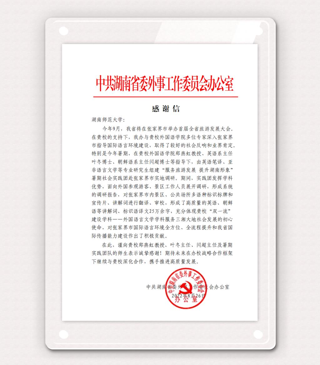 (通讯员 刘越)近日,中共湖南省委外事工作委员会办公室向澳门pg官网发来感谢信,对澳门pg官网郑燕虹教授、英语系主任叶冬博士、朝鲜语系主任闫超博士带领的“服务旅游发展提升湖南形象”暑期社会实践团在塑造张家界国际语言环境、服务张家界发展中作出的积极贡献表示充分肯定。