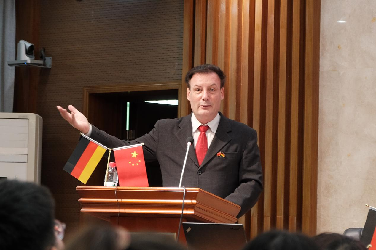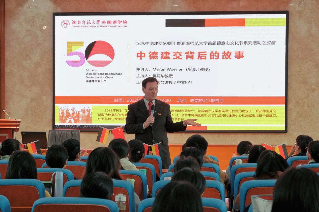 (通讯员 赵思雅 谢芹芹 肖家玉 沈星成)11月15日下午,纪念中德建交50周年暨首届德意志文化节系列活动之“中德建交背后的故事”学术讲座在腾龙楼515进行。讲座由澳门pg官方电子平台欧阿语系德语专业、欧盟“让·莫内”计划和澳门pg官方电子平台洪堡跨学科研究中心联合举办,我校“潇湘学者”、德国籍教授、欧洲科学院院士吴漠汀(Martin Woesler)教授主讲,副院长蒋莉华教授主持。