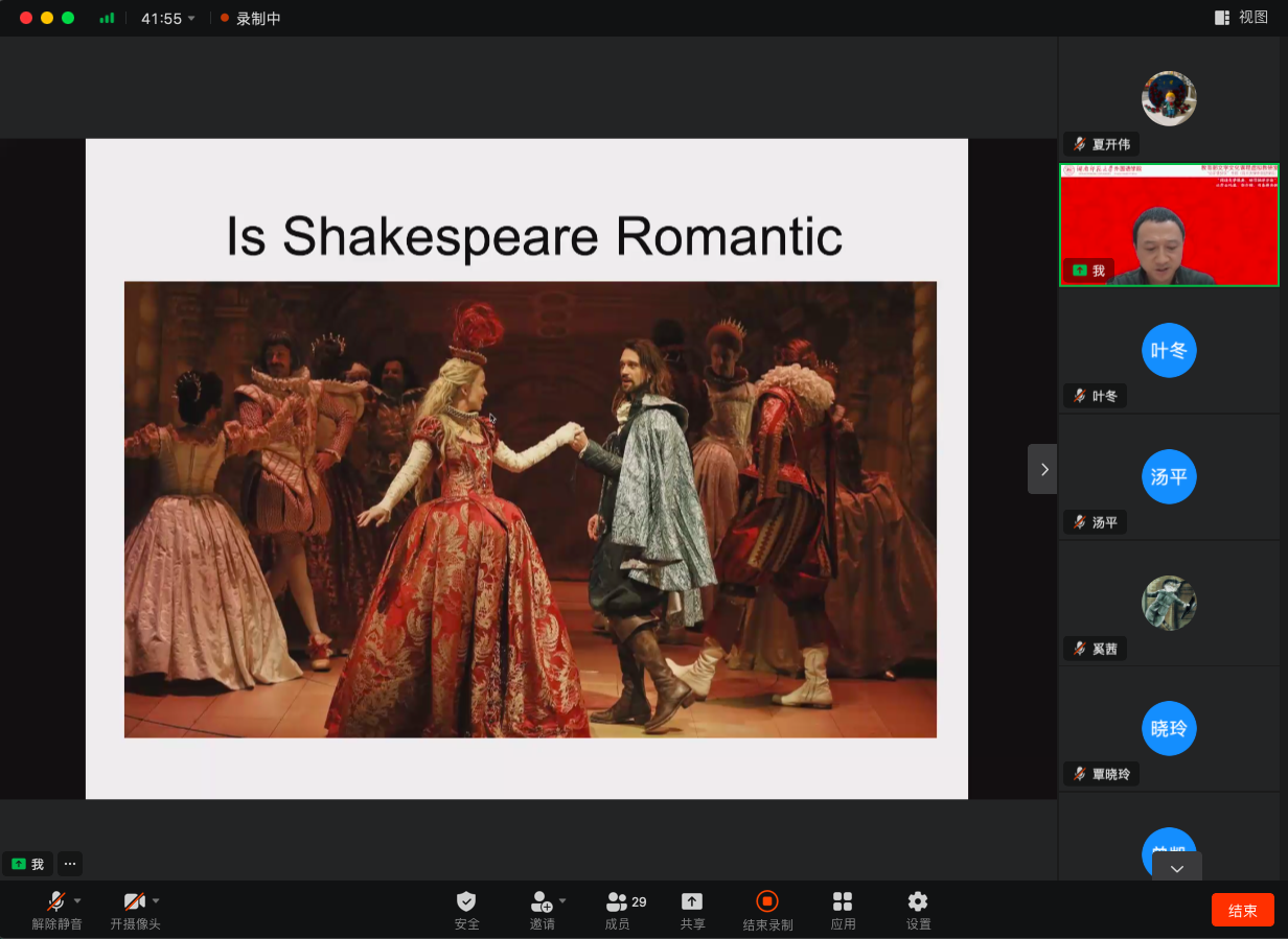 廖运刚副教授以“莎士比亚是否够浪漫”为题,通过分析《罗密欧与朱丽叶》、《仲夏夜之梦》、《威尼斯商人》等莎剧名篇,指出文本中的人、物、景与语言都体现了莎士比亚的浪漫气质。廖老师通过对莎士比亚戏剧和十四行诗中对话和意象的解读,指出“爱”是莎士比亚表达浪漫气质的媒介。从情人之爱到友人之爱,从宫廷之爱与婚姻重新探讨“爱”的含义,莎士比亚浪漫主义创作中又吊诡地展现出反讽。