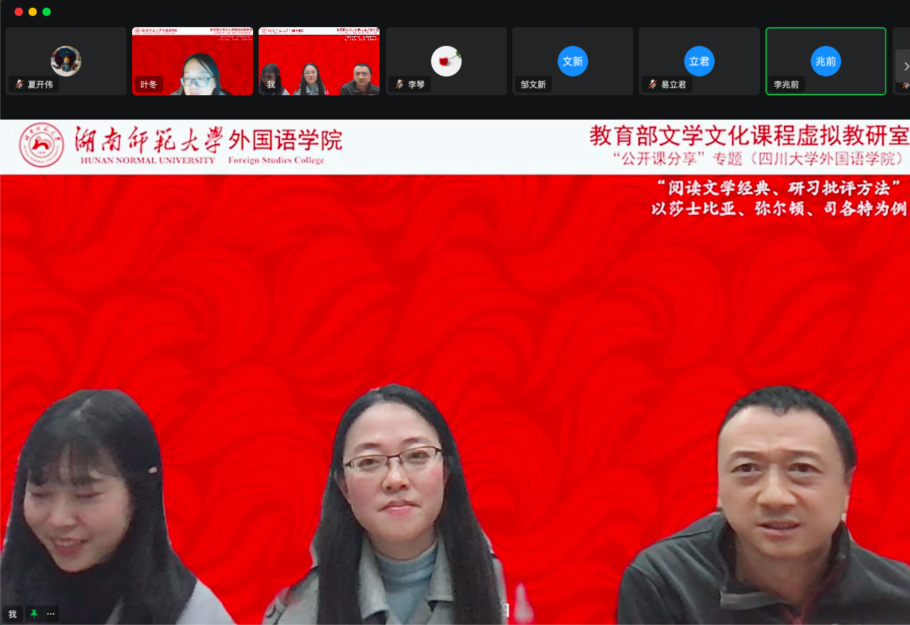 在接下来的互动环节中,澳门pg官方电子平台邹文新老师、李兆前老师、湖南科技大学曾绛老师等对于课程中关于莎士比亚戏剧教学的选材与方法、课时安排、英国文学课程与其他文学课程的衔接等诸多方面与三位主讲老师进行探讨。认为通过开设多种类型的文学课程来培养学生对文学的兴趣,以帮助他们更顺利地找到自己的研究方向。教师在课堂上应更多着重于阅读和思考的训练和指引。