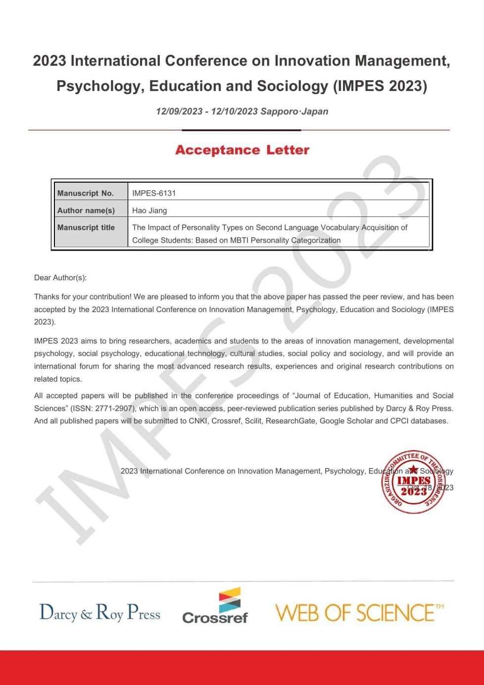 2023年10月18日,由澳门pg官网德语专业2021级本科生姜皓独立用英文撰写的论文“The Impact of Personality Types on Second Language Vocabulary Acquisition of College Students: Based on MBTI Personality Categorization”(《人格类型对大学生二语词汇习得的影响:基于 MBTI人格分类》)在国际会议“2023 International Conference on Innovation Management, Psychology, Education and Sociology” (IMPES 2023)上发表。该国际论文同时被Journal of Education, Humanities and Social Sciences(《教育、人文与社会科学杂志》,ISSN: 2771-2907)期刊收录。该期刊被CNKI、Crossref、Scilit、ResearchGate、Google Scholar和CPCI databases(世界著名的三大科技文献检索系统之一)等引文数据库收录为源刊。