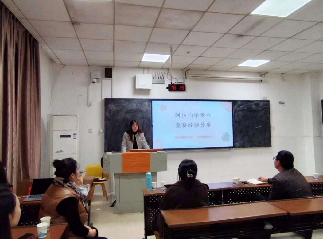 其次,刘泽钰以“阿拉伯国家概况课程思政建设路径”为题,分享了她在该课程中的探索实践、成效收获及反思总结,提出课程思政要从转变教学理念、更新教学内容、提升教学能力、改进教学方法等方面不断努力。随后,滕腾以“阿拉伯语专业竞赛经验分享”为题,向在场师生介绍了她在学生竞赛中的心得与体会。她表示一个良好的竞赛成绩离不开学校及学院的大力支持、同事间的相互协作以及学生自身的努力,同时,她也设置了未来阿拉伯语专业竞赛的规划和目标。