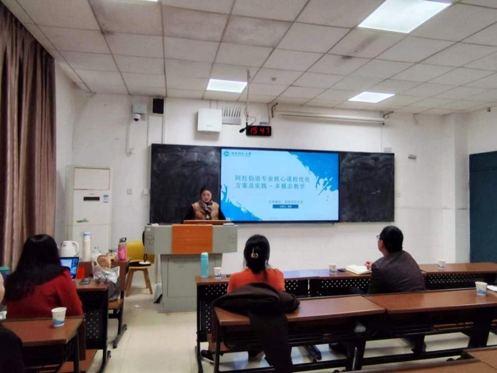 首先,王佳就阿拉伯语专业在学科建设上的成果和未来发展目标做了简要汇报,并围绕阿拉伯语专业核心课程优化方案与实践路径进行了深度分享。她表示阿拉伯语核心课程优化是一个持续的、系统的过程,要从创新教学方式、改进学习训练方式、丰富教学资源、完善教学评价体系、促进师生共同发展等多个方面去不断完善。同时,她结合所教授的《基础阿拉伯语》课程内容与在场师生分享了多模态教学在基础阿拉伯语课程中的应用和实践,提出多模态教学模式在语言教学中具备独特优势。