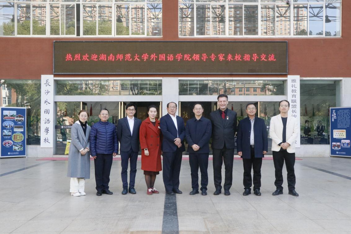 11月27日,天朗气清,惠风和畅。澳门pg官方电子平台(以下简称“师大外院”)党委书记沈贤岚、党委副书记莫南、欧洲科学院院士吴漠汀教授、语言学教研室主任副教授杨雨箫一行,前往长沙外国语学校调研交流。长沙外国语学校党委书记彭琨、校长严莹、副校长周琦勋、教务处副主任王琅及各实习指导老师参与调研。