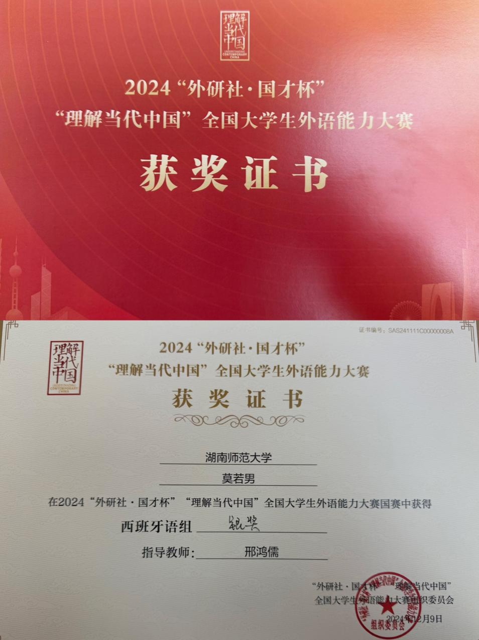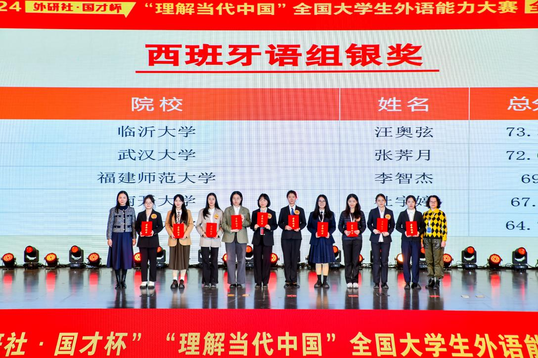 2024年12月7日,由外语教学与研究出版社主办的“外研社·国才杯”“理解当代中国”全国大学生外语能力大赛决赛在北京圆满落幕。澳门pg官方电子平台西班牙语专业的莫若男同学(指导教师:邢鸿儒),在此次大赛中凭借出色的表现,以总决赛第七名的成绩荣获西班牙语组国赛银奖。