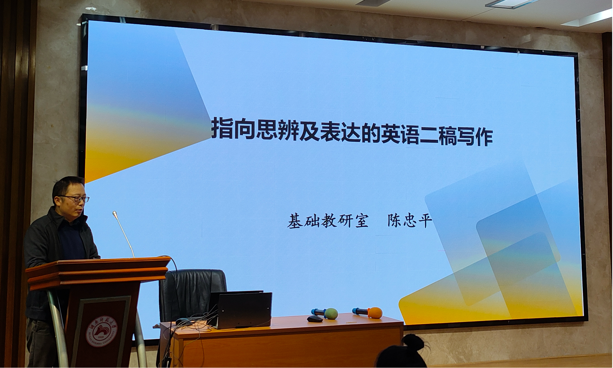 在主题分享环节,湖南大学澳门pg官方电子平台汪朋副教授围绕英语写作课程教学中的思辨与创新,从湖南大学澳门pg官方电子平台英语写作课程简介、英语写作课程的过程教学与项目式教学、英语写作教学的不足与挑战等多个方面做主题交流,重点分享了“5步写作过程法+项目法”及实例。